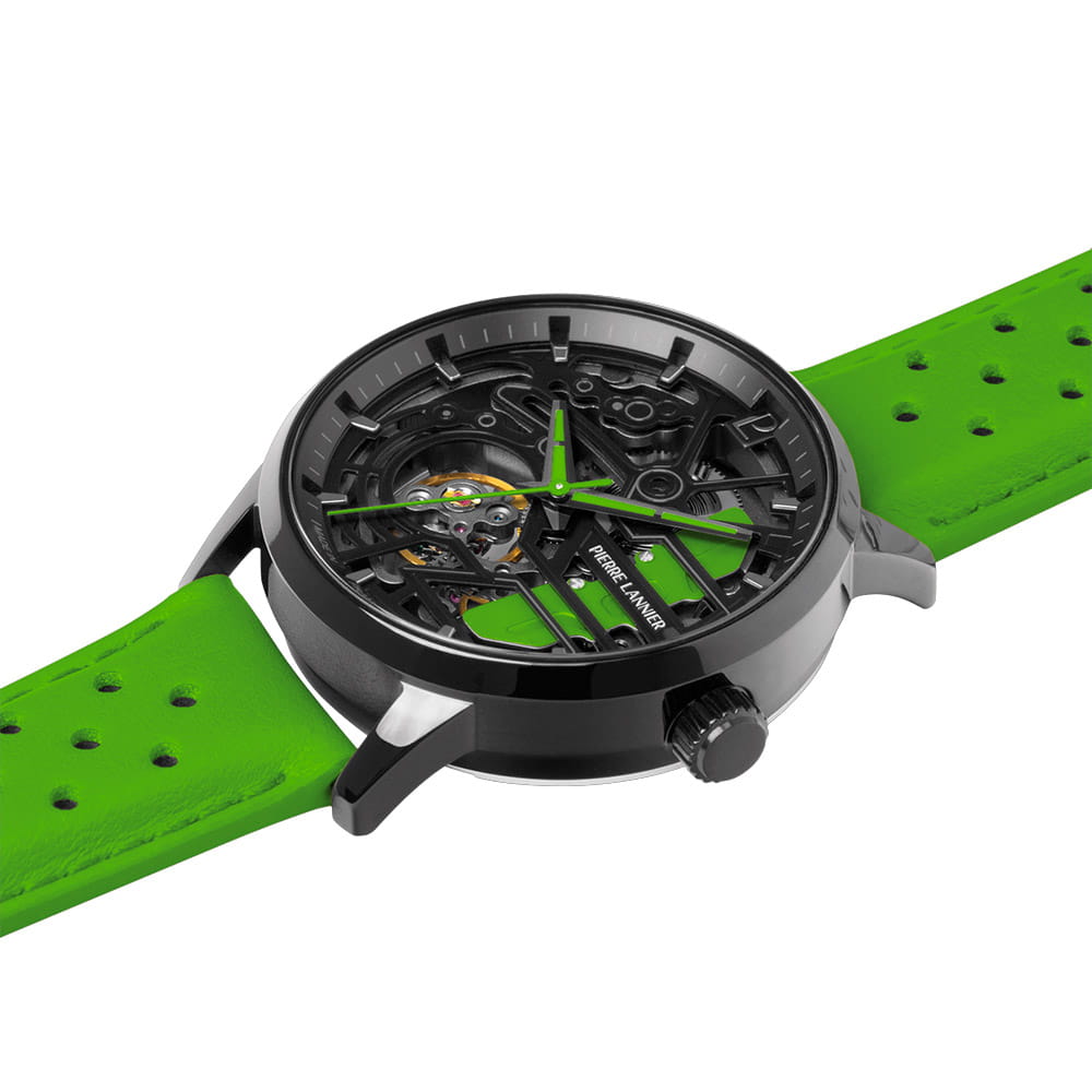 Pierre Lannier Paddock 145G877 — элегантная модель с выразительным спортивным характером. Корпус диаметром 39 мм выполнен из нержавеющей стали с матовым PVD-покрытиемPVDУльтратонкое покрытие наносится в технике вакуумного напыления, сочетает в себе нитрид титана особой прочности со слоем золота или оксида хрома. Несёт в себе декоративную или защитную функцию., подчёркивающим технологичный стиль и динамику дизайна. Циферблат частично скелетонизирован, открывая механизм и баланс, что придаёт модели техническую выразительность. Часовые метки и стрелки покрыты люминесцентным покрытиемЛюминесцентное покрытиеПозволяет считывать показания времени в темноте. Производители наносят на стрелки, часовые индексы, безель или поверхность циферблата светонакопительный состав, дающий холодное свечение., обеспечивая хорошую читаемость в любых условиях. Циферблат защищён прочным минеральным стекломМинеральное стеклоМинеральное стекло представляет собой искусственно выращенный минерал кварца. Такое стекло отличается особой устойчивостью к повреждениям и царапинам. Уступает по некоторым качествам сапфировому стеклу., устойчивым к царапинам и повседневным воздействиям. Водонепроницаемость до 50 метров позволяет использовать часы в различных жизненных ситуациях без ограничений. Внутри — автоматический механизм с автоподзаводом и запасом хода около 42 часов, не требующий подзарядки при регулярном ношении. Ремешок из перфорированной кожи шириной 20 мм дополнен удобной стандартной застежкой, обеспечивающей комфорт и надёжную фиксацию. Paddock — гармоничное сочетание механики, изящества и современного дизайна, созданное для тех, кто ценит уверенность и индивидуальность в деталях.