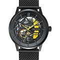 Мужские механические часы с автоподзаводом Pierre Lannier Paddock 338A439. Минеральное стеклоМинеральное стеклоМинеральное стекло представляет собой искусственно выращенный минерал кварца. Такое стекло отличается особой устойчивостью к повреждениям и царапинам. Уступает по некоторым качествам сапфировому стеклу. устойчивое к мелким механическим повреждениям. Центральные часовая, минутная и секундная стрелки. Корпус выполнен из нержавеющей стали с IP-покрытиемIP-покрытиеМетод ионного напыления. Демонстрирует повышенную устойчивость к истиранию, окислению и химическим веществам. Под воздействием высокого давления и температуры около 1500°C молекулы металла надёжно соединяются с частицами корпуса часов.. Водостойкость: 50 метров, позволит защитить корпус от случайных брызг или капель дождя. Стальной браслет миланского плетения с раскладной застёжкойРаскладная застёжкаТакой тип застёжки используется только на браслетах из металла. Она никогда не раскрывается полностью, происходит разделение на 2 и более частей. Раскладывающая застёжка снизит вероятность потери часов к минимуму.. Черный скелетонизированный циферблат.