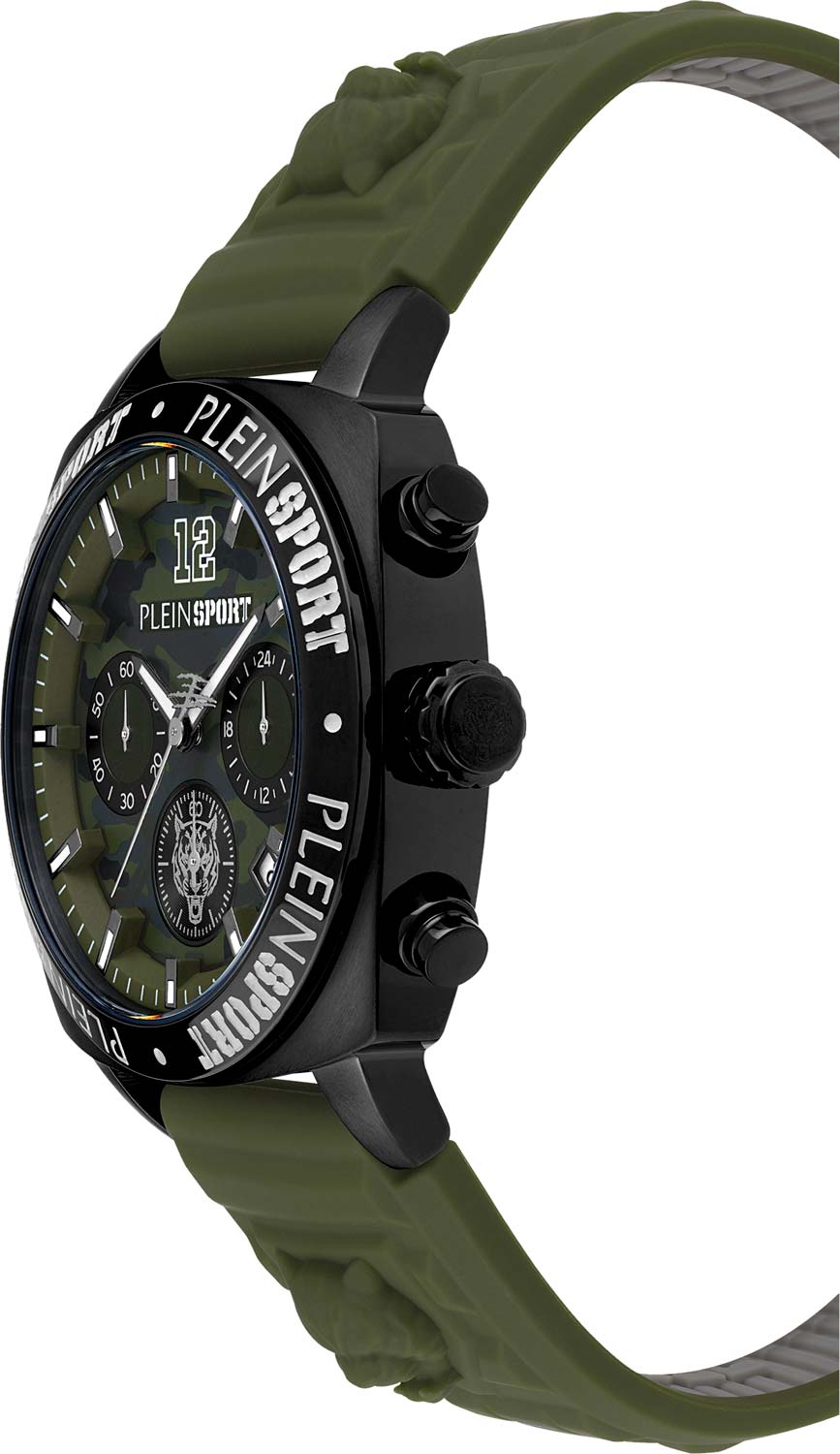 Немецкие мужские кварцевые часы-хронографХронографФункция позволяет измерять отрезки времени с особой точностью: часы, минуты, секунды. Верным признаком хронографа является наличие на циферблате 3 дополнительных окошек-счётчиков. с секундомеромСекундомерСекундоме́р — прибор, способный измерять интервалы времени с точностью до долей секунды. Plein Sport Wildcat PSGBA0223, кварцевый механизм с высокой точностью. Класс водозащиты: 50 метров, позволит защитить корпус от случайных брызг или капель дождя. Корпус часов изготовлен из стали с IP-покрытиемIP-покрытиеМетод ионного напыления. Демонстрирует повышенную устойчивость к истиранию, окислению и химическим веществам. Под воздействием высокого давления и температуры около 1500°C молекулы металла надёжно соединяются с частицами корпуса часов.. Стрелки и метки с люминесцентным покрытиемЛюминесцентное покрытиеПозволяет считывать показания времени в темноте. Производители наносят на стрелки, часовые индексы, безель или поверхность циферблата светонакопительный состав, дающий холодное свечение.. Силиконовый ремешок на стандартной застёжке. БезельБезельВнешний ободок, закрепляющий стекло. В спортивных часах так называется поворотное кольцо с делениями на циферблате, выполняет роль таймера – замеряет отрезки времени на шкале. Неподвижный безель – элемент декора. Однонаправленно вращающийся безель на дайверских часах позволяет фиксировать моменты погружения и выныривания на поверхность. с IP-покрытиемIP-покрытиеМетод ионного напыления. Демонстрирует повышенную устойчивость к истиранию, окислению и химическим веществам. Под воздействием высокого давления и температуры около 1500°C молекулы металла надёжно соединяются с частицами корпуса часов.. Окошко даты находится в положении между 4 и 5 часов.