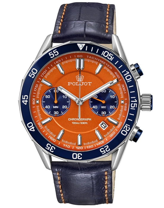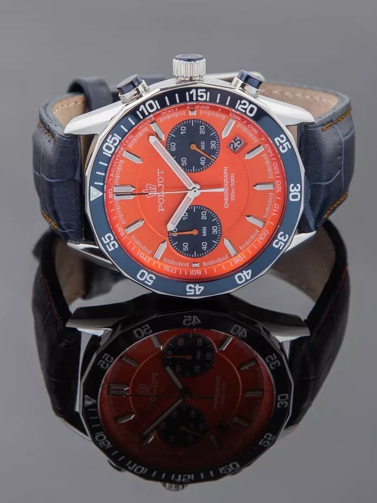 Poljot 6S21.181252 — яркие мужские часы с выразительным спортивным характером и акцентом на функциональность. Корпус из нержавеющей стали придаёт модели надёжность и солидность, а насыщенный циферблат с контрастными счётчиками хронографаХронографФункция позволяет измерять отрезки времени с особой точностью: часы, минуты, секунды. Верным признаком хронографа является наличие на циферблате 3 дополнительных окошек-счётчиков. создаёт динамичный и энергичный облик. БезельБезельВнешний ободок, закрепляющий стекло. В спортивных часах так называется поворотное кольцо с делениями на циферблате, выполняет роль таймера – замеряет отрезки времени на шкале. Неподвижный безель – элемент декора. Однонаправленно вращающийся безель на дайверских часах позволяет фиксировать моменты погружения и выныривания на поверхность. с PVD-покрытиемPVDУльтратонкое покрытие наносится в технике вакуумного напыления, сочетает в себе нитрид титана особой прочности со слоем золота или оксида хрома. Несёт в себе декоративную или защитную функцию.. Широкие стрелки и метки с люминесцентным покрытиемЛюминесцентное покрытиеПозволяет считывать показания времени в темноте. Производители наносят на стрелки, часовые индексы, безель или поверхность циферблата светонакопительный состав, дающий холодное свечение. обеспечивают отличную читаемость в любых условиях, а внешний обод с минутной шкалой подчёркивает спортивный стиль. Окно даты добавляет практичности. Прочное минеральное стеклоМинеральное стеклоМинеральное стекло представляет собой искусственно выращенный минерал кварца. Такое стекло отличается особой устойчивостью к повреждениям и царапинам. Уступает по некоторым качествам сапфировому стеклу. надёжно защищает циферблат от повреждений, а ремешок из натуральной кожи гармонично дополняет контрастную цветовую палитру. Poljot — это смелое сочетание спортивной энергии, точности и современного дизайна для активного и уверенного мужчины.