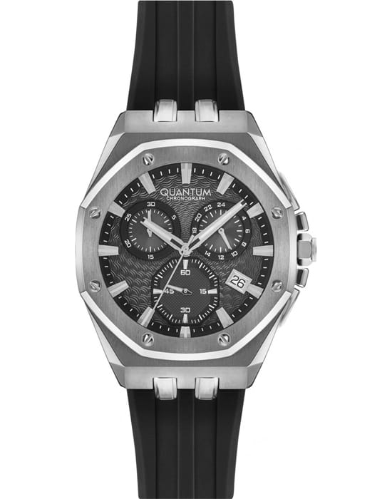 Мужские наручные часы-хронографХронографФункция позволяет измерять отрезки времени с особой точностью: часы, минуты, секунды. Верным признаком хронографа является наличие на циферблате 3 дополнительных окошек-счётчиков. Quantum HNG949.351, кварцевый механизм с высокой точностью. Минеральное стеклоМинеральное стеклоМинеральное стекло представляет собой искусственно выращенный минерал кварца. Такое стекло отличается особой устойчивостью к повреждениям и царапинам. Уступает по некоторым качествам сапфировому стеклу. устойчивое к появлению царапин, обладающее высокой прозрачностью. Класс водозащиты: 50 метров, позволит защитить корпус от случайных брызг или капель дождя. Стрелки и метки с люминесцентным покрытиемЛюминесцентное покрытиеПозволяет считывать показания времени в темноте. Производители наносят на стрелки, часовые индексы, безель или поверхность циферблата светонакопительный состав, дающий холодное свечение.. Корпус часов изготовлен из нержавеющей стали. Каучуковый ремешок.