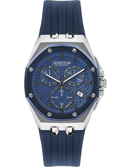 Мужские наручные часы-хронографХронографФункция позволяет измерять отрезки времени с особой точностью: часы, минуты, секунды. Верным признаком хронографа является наличие на циферблате 3 дополнительных окошек-счётчиков. Quantum HNG949.999, кварцевый механизм с высокой точностью. Минеральное стеклоМинеральное стеклоМинеральное стекло представляет собой искусственно выращенный минерал кварца. Такое стекло отличается особой устойчивостью к повреждениям и царапинам. Уступает по некоторым качествам сапфировому стеклу. устойчивое к появлению царапин, обладающее высокой прозрачностью. Класс водозащиты: 50 метров, позволит защитить корпус от случайных брызг или капель дождя. Стрелки с люминесцентным покрытиемЛюминесцентное покрытиеПозволяет считывать показания времени в темноте. Производители наносят на стрелки, часовые индексы, безель или поверхность циферблата светонакопительный состав, дающий холодное свечение.. Корпус часов изготовлен из нержавеющей стали. Каучуковый ремешок.
