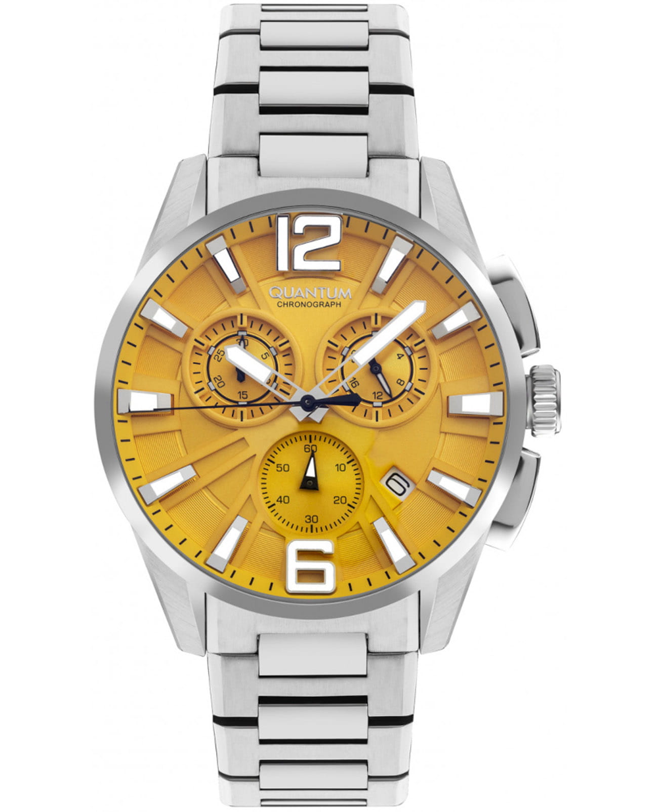 Мужские наручные часы-хронографХронографФункция позволяет измерять отрезки времени с особой точностью: часы, минуты, секунды. Верным признаком хронографа является наличие на циферблате 3 дополнительных окошек-счётчиков. Quantum PWG1077.300, кварцевый механизм с высокой точностью. Минеральное стеклоМинеральное стеклоМинеральное стекло представляет собой искусственно выращенный минерал кварца. Такое стекло отличается особой устойчивостью к повреждениям и царапинам. Уступает по некоторым качествам сапфировому стеклу. устойчивое к появлению царапин, обладающее высокой прозрачностью. Класс водозащиты: 100 метров, позволит плавать, нырять и заниматься другими водными видами спорта. Корпус часов изготовлен из нержавеющей стали. Стрелки и метки с люминесцентным покрытиемЛюминесцентное покрытиеПозволяет считывать показания времени в темноте. Производители наносят на стрелки, часовые индексы, безель или поверхность циферблата светонакопительный состав, дающий холодное свечение..Стальной браслет на раскладной застёжкеРаскладная застёжкаТакой тип застёжки используется только на браслетах из металла. Она никогда не раскрывается полностью, происходит разделение на 2 и более частей. Раскладывающая застёжка снизит вероятность потери часов к минимуму..