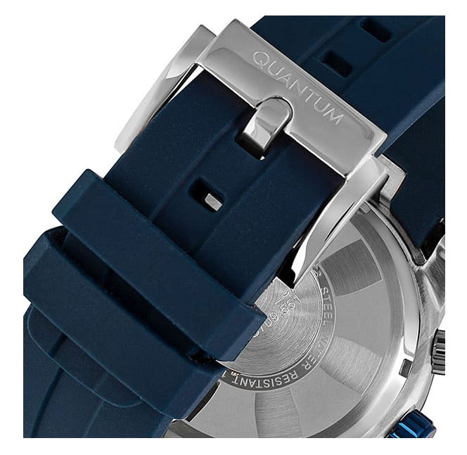 Мужские наручные часы Quantum PWG560.399 хронографХронографФункция позволяет измерять отрезки времени с особой точностью: часы, минуты, секунды. Верным признаком хронографа является наличие на циферблате 3 дополнительных окошек-счётчиков., кварцевый механизм с высокой точностью. Минеральное стеклоМинеральное стеклоМинеральное стекло представляет собой искусственно выращенный минерал кварца. Такое стекло отличается особой устойчивостью к повреждениям и царапинам. Уступает по некоторым качествам сапфировому стеклу. устойчивое к появлению царапин, обладающее высокой прозрачностью. Класс водозащиты: 100 метров, позволит плавать, нырять и заниматься другими водными видами спорта. Корпус часов изготовлен из нержавеющей стали. Стрелки и метки с люминесцентным покрытиемЛюминесцентное покрытиеПозволяет считывать показания времени в темноте. Производители наносят на стрелки, часовые индексы, безель или поверхность циферблата светонакопительный состав, дающий холодное свечение..Браслет из каучука на стандартной застежке. БезельБезельВнешний ободок, закрепляющий стекло. В спортивных часах так называется поворотное кольцо с делениями на циферблате, выполняет роль таймера – замеряет отрезки времени на шкале. Неподвижный безель – элемент декора. Однонаправленно вращающийся безель на дайверских часах позволяет фиксировать моменты погружения и выныривания на поверхность. с PVD-покрытиемPVDУльтратонкое покрытие наносится в технике вакуумного напыления, сочетает в себе нитрид титана особой прочности со слоем золота или оксида хрома. Несёт в себе декоративную или защитную функцию..