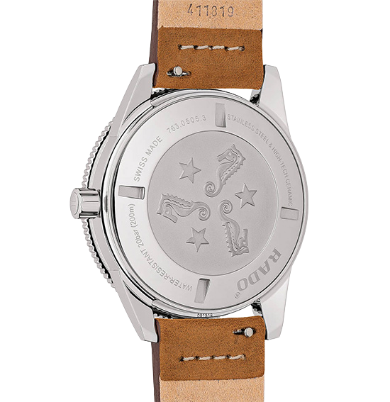 Премиальный аксессуар с винтажными элементами дизайна дополнен оригинальными стрелками, изображающими меч и стрелу. Надёжный корпус из нержавеющей стали 316L имеет синий безельБезельВнешний ободок, закрепляющий стекло. В спортивных часах так называется поворотное кольцо с делениями на циферблате, выполняет роль таймера – замеряет отрезки времени на шкале. Неподвижный безель – элемент декора. Однонаправленно вращающийся безель на дайверских часах позволяет фиксировать моменты погружения и выныривания на поверхность. из высокотехнологичной керамикиВысокотехнологичная керамикаИнновационный запатентованный Rado материал с гладкой или матовой поверхностью. Керамика за счёт кристаллической структуры обладает повышенной устойчивостью от возникновения царапин. Материал способен принимать температуру тела человека, обеспечивая невероятный комфорт при ношении., снижающий вес часов и препятствующий возникновению царапин. Швейцарский автоматический механизм ETA C07.611 с 80-часовым резервом хода. Стекло из сапфира с антибликовым покрытием. Ремешок из натуральной кожи. Люминесцентная подсветкаЛюминесцентное покрытиеПозволяет считывать показания времени в темноте. Производители наносят на стрелки, часовые индексы, безель или поверхность циферблата светонакопительный состав, дающий холодное свечение.. Водостойкость 20 бар. Завинчивающаяся задняя крышка, закручивающаяся заводная головка. . Отображение числа. Диаметр корпуса: 42 мм.