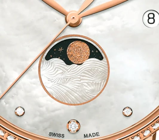 Модель относится к премиальной категории, это наилучший вариант для дополнения дорогого брендового костюма или платья для торжественного мероприятия. В качестве декорирующих элементов выступают 72 бриллианта в 0,273 карат, драгоценные камни оттенка Top Wesselton украшают перламутровый циферблат и безельБезельВнешний ободок, закрепляющий стекло. В спортивных часах так называется поворотное кольцо с делениями на циферблате, выполняет роль таймера – замеряет отрезки времени на шкале. Неподвижный безель – элемент декора. Однонаправленно вращающийся безель на дайверских часах позволяет фиксировать моменты погружения и выныривания на поверхность.. Сапфировое стекло с антибликовым покрытием. Корпус и браслетом с золотистым PVD-финишемPVDУльтратонкое покрытие наносится в технике вакуумного напыления, сочетает в себе нитрид титана особой прочности со слоем золота или оксида хрома. Несёт в себе декоративную или защитную функцию.. Браслет из нержавеющей стали с раскладывающейся застежкой сводит к минимуму вероятность потери модели. Отображение фаз луны, индикация текущего числа. Диаметр корпуса: 34 мм.