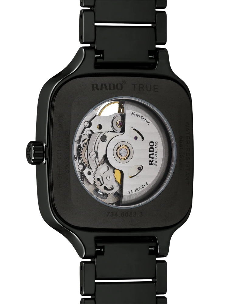 Швейцарские механические часы с автоподзаводом Rado True Square Automatic Open Heart R27086152. True Square - это новый взгляд на культовую форму Rado. Первые часы True Square, изготовленные с использованием моноблочного высокотехнологичного керамическогоВысокотехнологичная керамикаИнновационный запатентованный Rado материал с гладкой или матовой поверхностью. Керамика за счёт кристаллической структуры обладает повышенной устойчивостью от возникновения царапин. Материал способен принимать температуру тела человека, обеспечивая невероятный комфорт при ношении. корпуса квадратной формы, легкие, устойчивые к царапинам и удобные в носке. Швейцарский автоматический механизм отличается резервом хода на 80 часов. Стрелки и метки дополнены ярким люминесцентным покрытиемЛюминесцентное покрытиеПозволяет считывать показания времени в темноте. Производители наносят на стрелки, часовые индексы, безель или поверхность циферблата светонакопительный состав, дающий холодное свечение.. Класс водозащиты: 50 метров, позволит защитить корпус от случайных брызг или капель дождя. Браслет из высокотехнологичной керамикиВысокотехнологичная керамикаИнновационный запатентованный Rado материал с гладкой или матовой поверхностью. Керамика за счёт кристаллической структуры обладает повышенной устойчивостью от возникновения царапин. Материал способен принимать температуру тела человека, обеспечивая невероятный комфорт при ношении. на застёжке-бабочкеЗастёжка "бабочка"Такой вид застёжки дополняется предохранителями, помогающими избежать случайного раскрытия браслета. Обладают изящным исполнением. .
