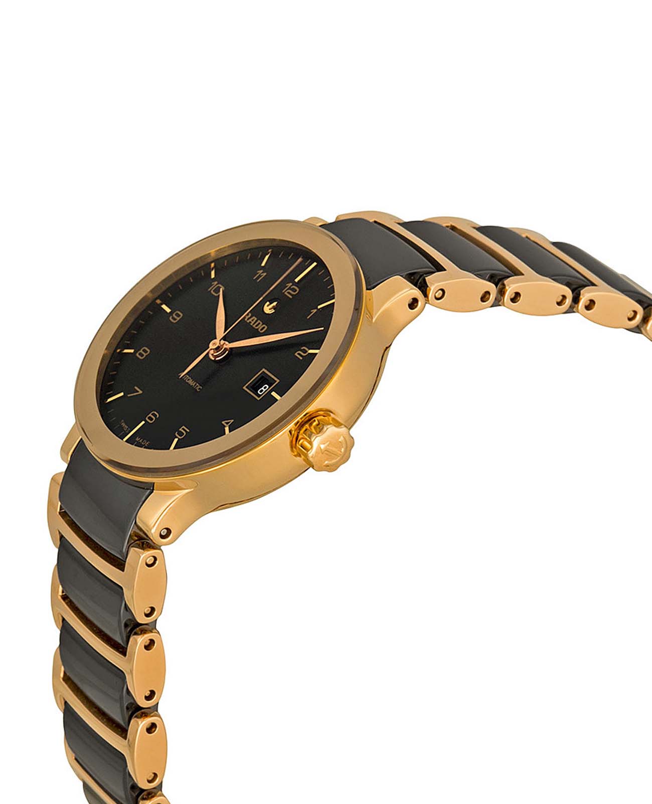 Швейцарские женские механические часы с автоподзаводом Rado Centrix Diamonds R30954152. Сапфировое стеклоСапфировое стеклоПрочный и надёжный материал из кристалла сапфира синтетического происхождения, характеризующийся особой твёрдостью и устойчивостью к царапинам и повреждениям. устойчивое к появлению царапин, обладающее высокой прозрачностью. Корпус часов изготовлен из нержавеющей стали с PVD-покрытиемPVDУльтратонкое покрытие наносится в технике вакуумного напыления, сочетает в себе нитрид титана особой прочности со слоем золота или оксида хрома. Несёт в себе декоративную или защитную функцию.. Окошко даты находится в положении 3 часа. Класс водозащиты: 30 метров, позволит защитить корпус от случайных брызг или капель дождя. Браслет из высокотехнологичной керамикиВысокотехнологичная керамикаИнновационный запатентованный Rado материал с гладкой или матовой поверхностью. Керамика за счёт кристаллической структуры обладает повышенной устойчивостью от возникновения царапин. Материал способен принимать температуру тела человека, обеспечивая невероятный комфорт при ношении. и нержавеющей стали с PVD-покрытиемPVDУльтратонкое покрытие наносится в технике вакуумного напыления, сочетает в себе нитрид титана особой прочности со слоем золота или оксида хрома. Несёт в себе декоративную или защитную функцию. на раскладной застёжкеРаскладная застёжкаТакой тип застёжки используется только на браслетах из металла. Она никогда не раскрывается полностью, происходит разделение на 2 и более частей. Раскладывающая застёжка снизит вероятность потери часов к минимуму..