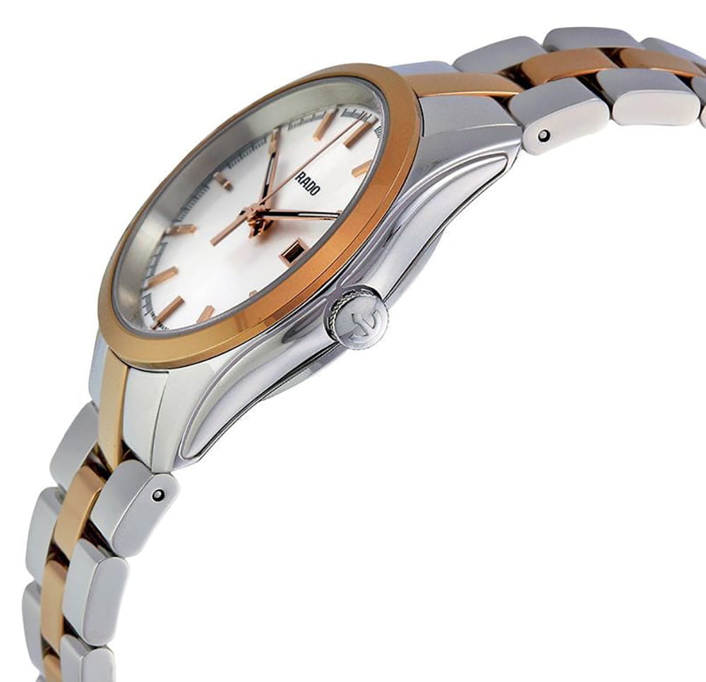 Женские швейцарские часы с надёжным кварцевым механизмом Rado Hyperchrome R32976102. Сапфировое стеклоСапфировое стеклоПрочный и надёжный материал из кристалла сапфира синтетического происхождения, характеризующийся особой твёрдостью и устойчивостью к царапинам и повреждениям. устойчивое к мелким механическим повреждениям. Корпус часов изготовлены из нержавеющей стали. Стальной браслет с CeramosCeramosМатериал являет собой инновационное сочетание высокотехнологичной керамики и сплава металла. Он объединяет керамическую устойчивость к царапинам и металлический роскошный блеск. на раскладной застёжкеРаскладная застёжкаТакой тип застёжки используется только на браслетах из металла. Она никогда не раскрывается полностью, происходит разделение на 2 и более частей. Раскладывающая застёжка снизит вероятность потери часов к минимуму.. Окошко даты находится в положении 3 часа. Стрелки с люминесцентным покрытиемЛюминесцентное покрытиеПозволяет считывать показания времени в темноте. Производители наносят на стрелки, часовые индексы, безель или поверхность циферблата светонакопительный состав, дающий холодное свечение.. Класс водозащиты: 50 метров, позволит защитить корпус от случайных брызг или капель дождя. БезельБезельВнешний ободок, закрепляющий стекло. В спортивных часах так называется поворотное кольцо с делениями на циферблате, выполняет роль таймера – замеряет отрезки времени на шкале. Неподвижный безель – элемент декора. Однонаправленно вращающийся безель на дайверских часах позволяет фиксировать моменты погружения и выныривания на поверхность. с CeramosCeramosМатериал являет собой инновационное сочетание высокотехнологичной керамики и сплава металла. Он объединяет керамическую устойчивость к царапинам и металлический роскошный блеск. .