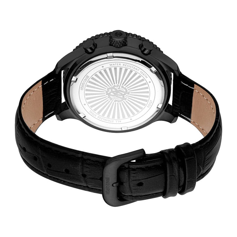 Roberto Cavalli Stile RC5G127L0045 — мужская кварцевая модель с ярко выраженным спортивным характером, сочетающая функциональность и надёжность. Корпус диаметром 44 мм выполнен из нержавеющей стали с PVD-покрытиемPVDУльтратонкое покрытие наносится в технике вакуумного напыления, сочетает в себе нитрид титана особой прочности со слоем золота или оксида хрома. Несёт в себе декоративную или защитную функцию., сочетание матовых и полированных поверхностей придаёт часам современный вид. Защитную роль выполняет прочное минеральное стеклоМинеральное стеклоМинеральное стекло представляет собой искусственно выращенный минерал кварца. Такое стекло отличается особой устойчивостью к повреждениям и царапинам. Уступает по некоторым качествам сапфировому стеклу., устойчивое к повседневным воздействиям. Водозащита 100 м позволяет без опасений использовать модель во время плавания и активного отдыха. На циферблате реализованы функции хронографаХронографФункция позволяет измерять отрезки времени с особой точностью: часы, минуты, секунды. Верным признаком хронографа является наличие на циферблате 3 дополнительных окошек-счётчиков. и даты, благодаря чему часы сочетают спортивную эстетику и практичность. Кожаный ремешок шириной 20 мм подчеркивает классический стиль, обеспечивает удобство в ношении и гармонично завершает дизайн, делая модель универсальным спутником как для повседневного образа, так и для активного досуга.