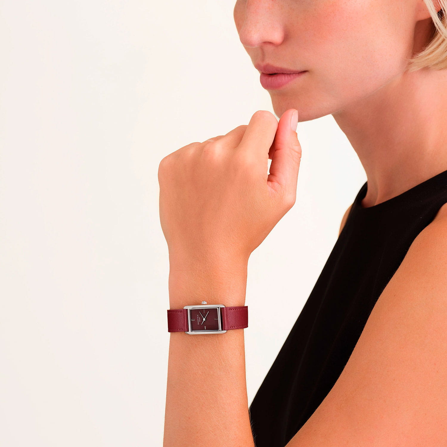 Модель оснащена кварцевым механизмом, который гарантирует точное измерение времени. Бордовый кожаный ремешок шириной 16 мм обеспечивает комфортное ношение и гармонично дополняет общий дизайн.