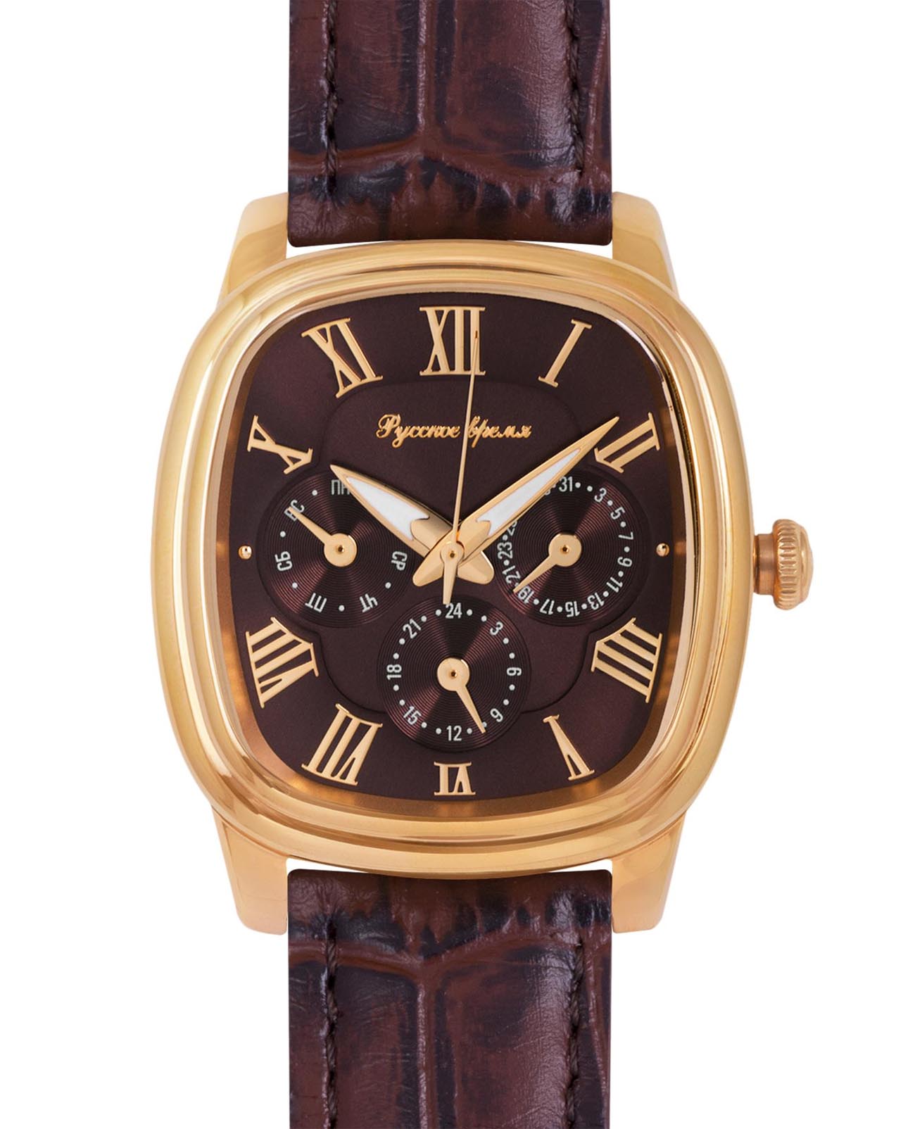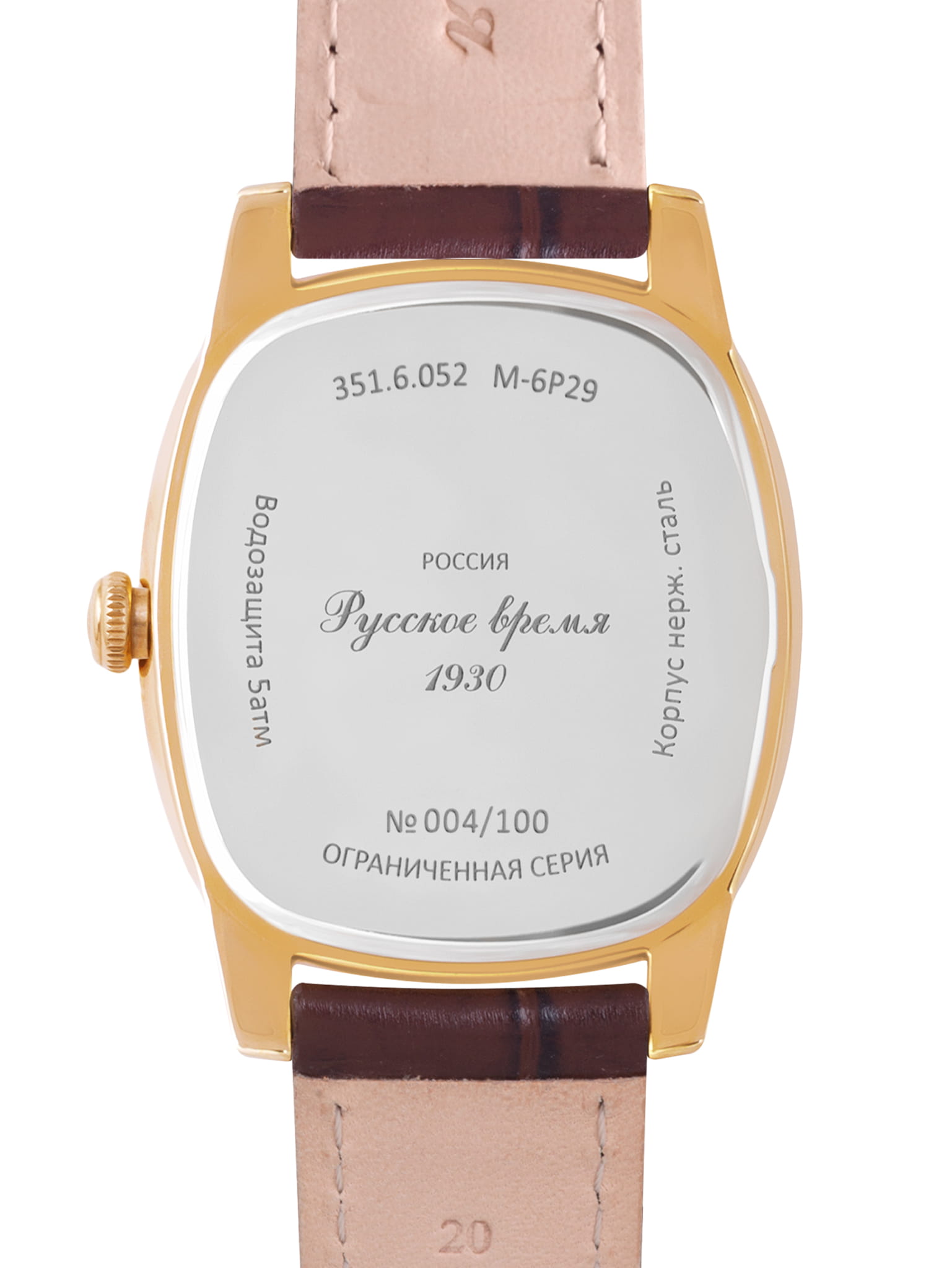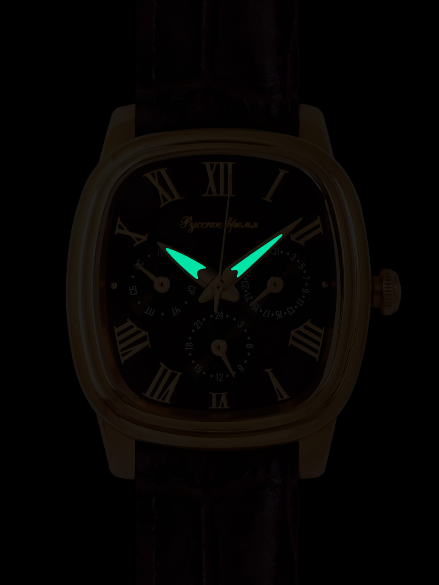 Русское время 3516052 — это мужские часы с классическим дизайном, сочетающие функциональность и стиль. Корпус диаметром 41 мм выполнен из нержавеющей стали с PVD-покрытиемPVDУльтратонкое покрытие наносится в технике вакуумного напыления, сочетает в себе нитрид титана особой прочности со слоем золота или оксида хрома. Несёт в себе декоративную или защитную функцию., что придаёт часам прочность и долговечность. Циферблат с чёткими метками и стрелками, покрытыми люминесцентным покрытиемЛюминесцентное покрытиеПозволяет считывать показания времени в темноте. Производители наносят на стрелки, часовые индексы, безель или поверхность циферблата светонакопительный состав, дающий холодное свечение., обеспечивает удобство чтения в темноте. Окошко даты расположено на отметке «3 часа» для удобства. Минеральное стекло защищает циферблат от царапин, а водонепроницаемость до 50 метров позволяет носить часы в повседневной жизни, не беспокоясь о сохранности механизма. Часы оснащены кварцевым механизмом, что гарантирует точность хода. Ремешок выполнен из натуральной кожи, что придаёт часам изысканный вид и комфорт при носке.