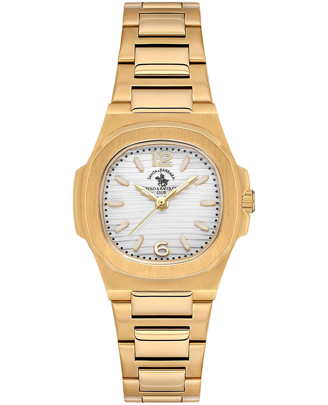 Женские кварцевые Santa Barbara Polo & Racquet Club SB.1.10590-3 — воплощение элегантности и технического совершенства. Изысканный корпус из нержавеющей стали с IP-покрытиемIP-покрытиеМетод ионного напыления. Демонстрирует повышенную устойчивость к истиранию, окислению и химическим веществам. Под воздействием высокого давления и температуры около 1500°C молекулы металла надёжно соединяются с частицами корпуса часов. золотистого цвета, диаметром 26,2 мм, что делает их устойчивыми к внешним воздействиям и придает благородный вид. Стрелки и метки с люминесцентным покрытиемЛюминесцентное покрытиеПозволяет считывать показания времени в темноте. Производители наносят на стрелки, часовые индексы, безель или поверхность циферблата светонакопительный состав, дающий холодное свечение., обеспечивающим хорошую читаемость в темноте. Изящный циферблат защищён минеральным стекломМинеральное стеклоМинеральное стекло представляет собой искусственно выращенный минерал кварца. Такое стекло отличается особой устойчивостью к повреждениям и царапинам. Уступает по некоторым качествам сапфировому стеклу., устойчивое к царапинам и механическим повреждениям. Браслет из стали с IP-покрытиемIP-покрытиеМетод ионного напыления. Демонстрирует повышенную устойчивость к истиранию, окислению и химическим веществам. Под воздействием высокого давления и температуры около 1500°C молекулы металла надёжно соединяются с частицами корпуса часов. на раскладной застёжкеРаскладная застёжкаТакой тип застёжки используется только на браслетах из металла. Она никогда не раскрывается полностью, происходит разделение на 2 и более частей. Раскладывающая застёжка снизит вероятность потери часов к минимуму. обеспечивает комфортное и безопасное ношение. Водонепроницаемость 50 метров позволит защитить корпус от случайных брызг или капель дождя. Идеальный выбор для тех, кто ценит элегантный дизайн и качество.