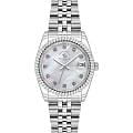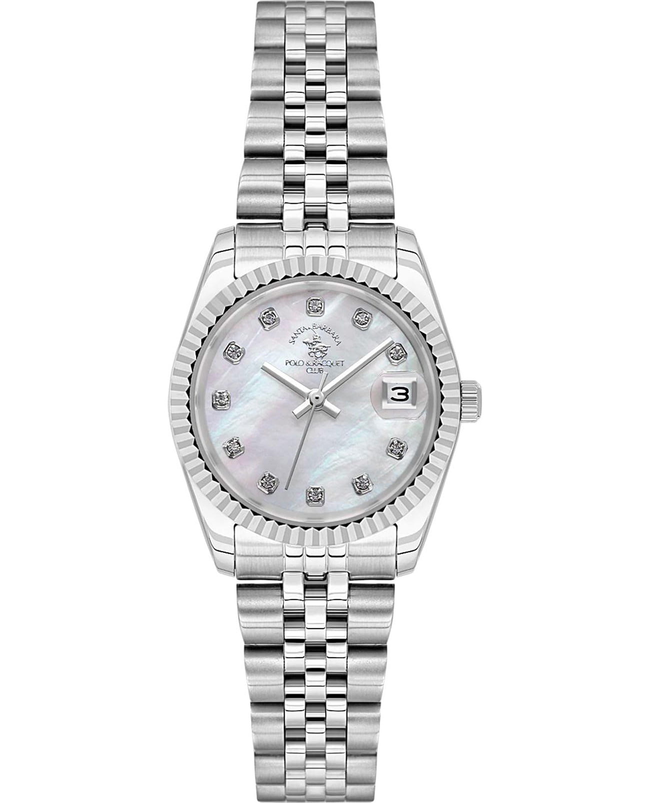 Женские кварцевые часы Santa Barbara Polo & Racquet Club — это изысканный и элегантный аксессуар. Корпус диаметром 28 мм выполнен из стали 316L. БезельБезельВнешний ободок, закрепляющий стекло. В спортивных часах так называется поворотное кольцо с делениями на циферблате, выполняет роль таймера – замеряет отрезки времени на шкале. Неподвижный безель – элемент декора. Однонаправленно вращающийся безель на дайверских часах позволяет фиксировать моменты погружения и выныривания на поверхность. рифлёный, декоративный. Циферблат перламутрового белого цвета оформлен точками, инкрустированными кристаллами, и прямоугольными стрелками в стиле Baton. Окошко даты расположено в положении 3 часов и оснащено увеличительным стеклом (Cyclops). Циферблат защищён минеральным стекломМинеральное стеклоМинеральное стекло представляет собой искусственно выращенный минерал кварца. Такое стекло отличается особой устойчивостью к повреждениям и царапинам. Уступает по некоторым качествам сапфировому стеклу.. Часы оснащены стальным браслетом на раскладной застёжкеРаскладная застёжкаТакой тип застёжки используется только на браслетах из металла. Она никогда не раскрывается полностью, происходит разделение на 2 и более частей. Раскладывающая застёжка снизит вероятность потери часов к минимуму.. Водонепроницаемость 30 м позволяет использовать часы в повседневных условиях. Идеальный выбор для тех, кто ценит американское качество и классический дизайн.