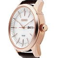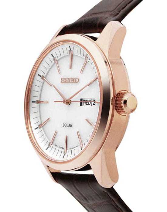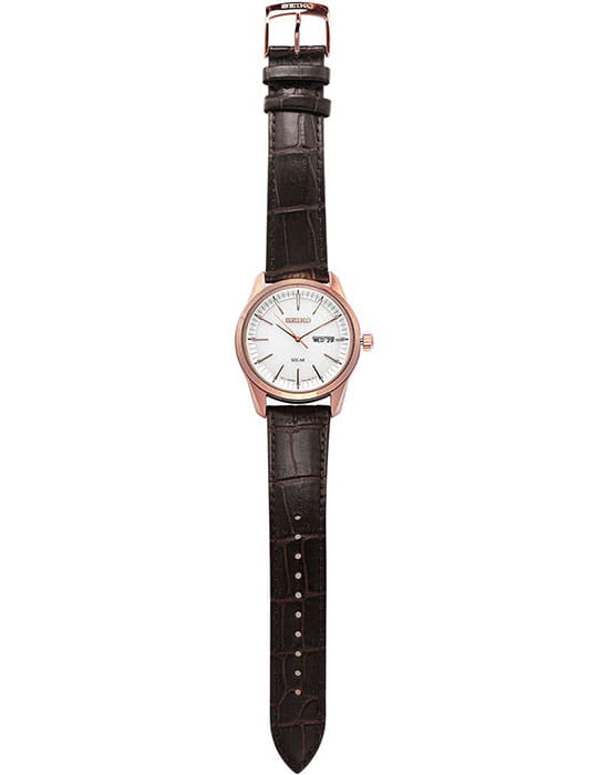 Наручные часы представлены в классическом исполнении, сдержанная цветовая гамма делает их вневременным аксессуаром. Они получают энергию от любого источника света благодаря солнечной панели. Модель с технологией при полном заряде батарейки проработает 10 месяцев. В качестве материала для корпуса выбрана хирургическая сталь 316L, устойчивая к повреждениям и коррозии. Минималистичный циферблат защищает сапфировое стекло, препятствующее возникновению царапин. Точность хода +/- 15 секунд в месяц обеспечивает японский кварцевый механизм Seiko V158. Дополнительную герметичность обеспечивает завинчивающаяся задняя крышка, заводная головка с винтовым фиксатором. На позиции 3 часов – указатель даты и дня недели. Ремешок сделан из натуральной кожи. Диаметр корпуса: 40 мм.