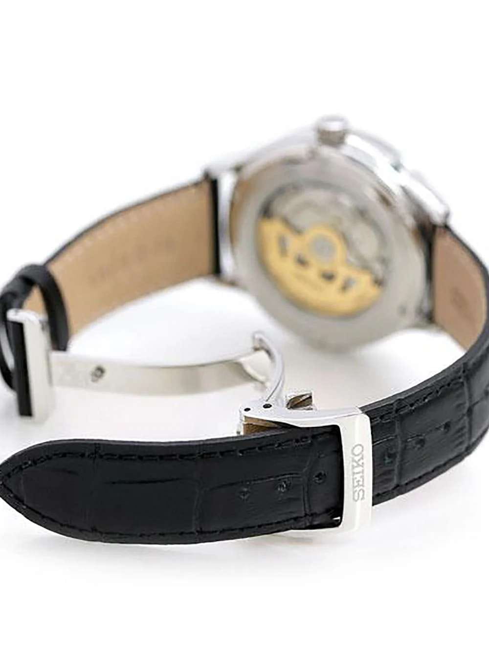 Мужские механические часы с автоподзаводом Seiko SARY095 — элегантное сочетание японской инженерии и классического дизайна. Круглый корпус размером 41 мм из нержавеющей стали, белый циферблат с римскими цифрами и частично скелетонизированным циферблатом, а также 24-часовой стрелкой. Стекло — сапфировоеСапфировое стеклоПрочный и надёжный материал из кристалла сапфира синтетического происхождения, характеризующийся особой твёрдостью и устойчивостью к царапинам и повреждениям.. Механизм японский калибр 4R39 (24 камня, запас хода 41 час), с функцией stop-second и возможностью ручного завода. Водонепроницаемость 30 м. Ремешок чёрный кожаный на раскладной застёжкеРаскладная застёжкаТакой тип застёжки используется только на браслетах из металла. Она никогда не раскрывается полностью, происходит разделение на 2 и более частей. Раскладывающая застёжка снизит вероятность потери часов к минимуму.. Задняя крышка — прозрачная и завинчивающаяся. Идеальный выбор для тех, кто ценит японское качество и классический стиль.