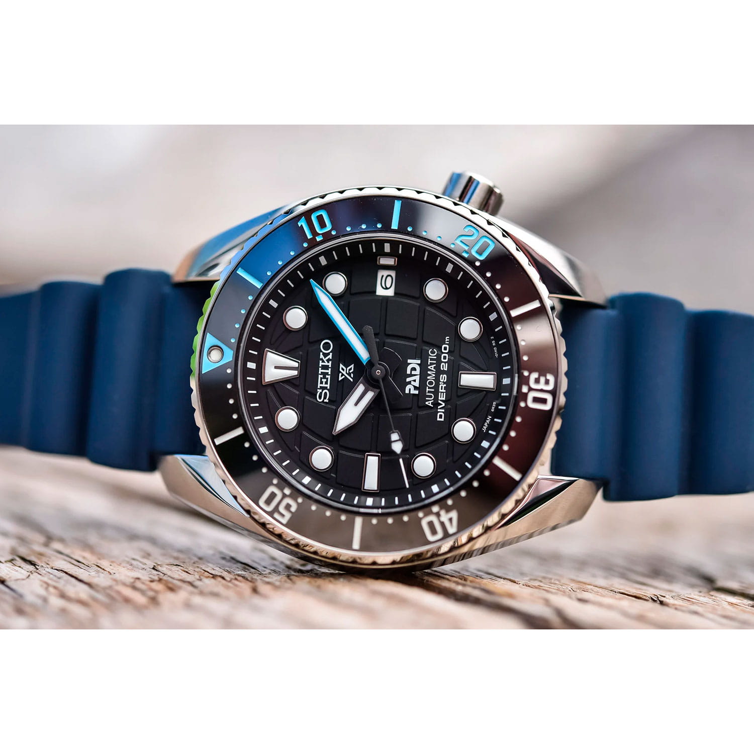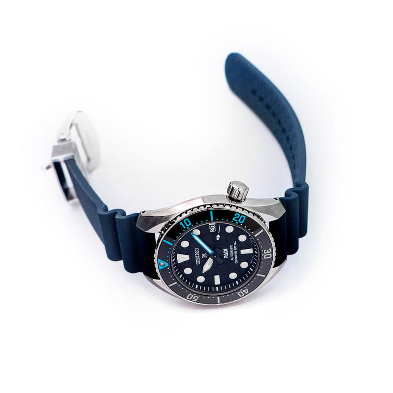 Seiko Prospex SPB325J1 — профессиональные дайверские часы, созданные с учётом строгих стандартов для подводных погружений. Крупный корпус диаметром 45 мм выполнен из нержавеющей стали с сатинированной и полированной обработкой, а массивный односторонний вращающийся безельБезельВнешний ободок, закрепляющий стекло. В спортивных часах так называется поворотное кольцо с делениями на циферблате, выполняет роль таймера – замеряет отрезки времени на шкале. Неподвижный безель – элемент декора. Однонаправленно вращающийся безель на дайверских часах позволяет фиксировать моменты погружения и выныривания на поверхность. с PVD-покрытиемPVDУльтратонкое покрытие наносится в технике вакуумного напыления, сочетает в себе нитрид титана особой прочности со слоем золота или оксида хрома. Несёт в себе декоративную или защитную функцию. с минутной шкалой облегчает контроль времени под водой. Защитную функцию выполняет сапфировое стеклоСапфировое стеклоПрочный и надёжный материал из кристалла сапфира синтетического происхождения, характеризующийся особой твёрдостью и устойчивостью к царапинам и повреждениям. с антибликовым покрытиемАнтибликовое покрытиеСлой оксида металла в 0,13-0,3 микрон, благодаря которому стекло часов не бликует и не отражает свет. Антибликовое покрытие уменьшает отражение света в 10 раз, обеспечивая отличную читаемость показателей циферблата., обеспечивающим высокую читаемость в любых условиях. Внутри установлен автоматический калибр 4R35 с возможностью ручного завода, стоп-секундой и запасом хода около 70 часа. Водозащита 200 м (20 бар) соответствует международному стандарту ISO для дайверских часов. Чёрный циферблат с крупными метками и стрелками покрыт люминесцентным покрытиемЛюминесцентное покрытиеПозволяет считывать показания времени в темноте. Производители наносят на стрелки, часовые индексы, безель или поверхность циферблата светонакопительный состав, дающий холодное свечение., что гарантирует видимость даже в кромешной темноте. Часы комплектуются прочным каучуковым ремешком с классической застёжкой, который устойчив к влаге и морской соли, делая модель надёжным инструментом для настоящего дайвинга.