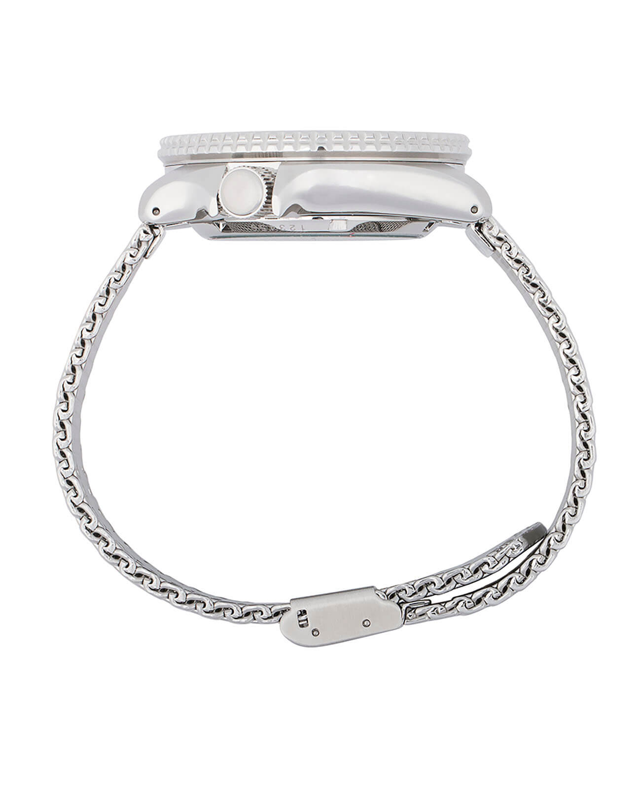 Водозащита 100 метров (10 атм) позволяет использовать часы для плавания и других водных видов спорта. Стальной браслет с миланским плетением и раскладной застёжкой Раскладная застёжкаРаскладная застёжкаТакой тип застёжки используется только на браслетах из металла. Она никогда не раскрывается полностью, происходит разделение на 2 и более частей. Раскладывающая застёжка снизит вероятность потери часов к минимуму. обеспечивает комфортное ношение и надёжную фиксацию на запястье. ​​