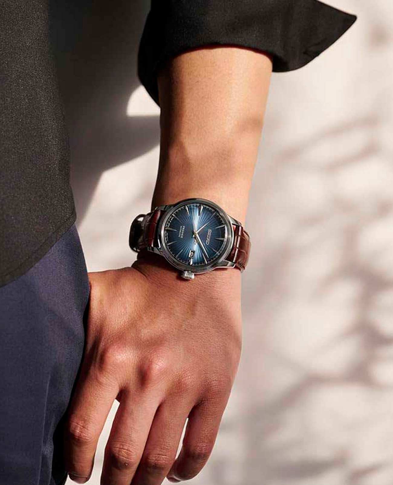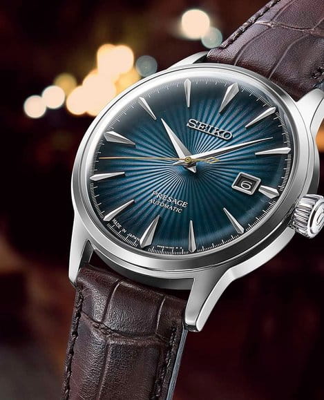 Мужские наручные часы Seiko SRPK15J1 из коллекции Presage Cocktail Time сочетают в себе классический дизайн и надежность современных технологий. Модель обладает круглым корпусом диаметром 40,5 мм, изготовленным из нержавеющей стали, что обеспечивает высокую устойчивость к внешним воздействиям . Толщина корпуса составляет 11,8 мм, а для защиты используется минеральное стеклоМинеральное стеклоМинеральное стекло представляет собой искусственно выращенный минерал кварца. Такое стекло отличается особой устойчивостью к повреждениям и царапинам. Уступает по некоторым качествам сапфировому стеклу. Hardlex Crystal, обеспечивающее прочную защиту от царапин . Ремешок выполнен из кожи на стандартной застежке, которая подчеркивает элегантный стиль модели . Циферблат синего цвета украшен текстурой, вдохновленной культурой японских коктейлей, и оснащен окном даты на позиции «3 часа» . Часы работают на автоматическом механизме с калибром 4R35, который включает 23 камня и обладает запасом хода до 41 часа . Водонепроницаемость составляет WR 50, что позволяет защитить корпус от случайных брызг и кратковременного контакта с водой.