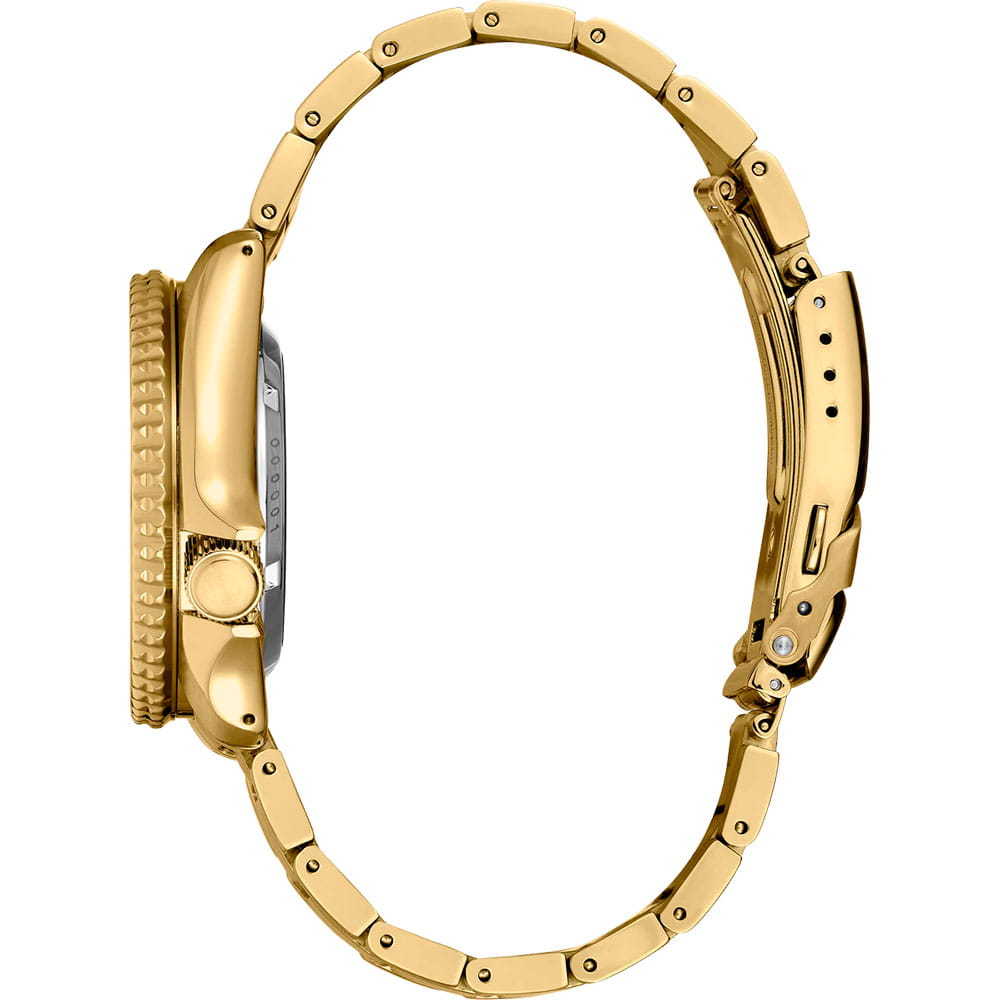 Водозащита 100 метров (10 бар) позволяет использовать часы для плавания и других водных видов спорта. Стальной браслет с PVD-покрытиемPVDУльтратонкое покрытие наносится в технике вакуумного напыления, сочетает в себе нитрид титана особой прочности со слоем золота или оксида хрома. Несёт в себе декоративную или защитную функцию. золотого цвета и раскладной застёжкойРаскладная застёжкаТакой тип застёжки используется только на браслетах из металла. Она никогда не раскрывается полностью, происходит разделение на 2 и более частей. Раскладывающая застёжка снизит вероятность потери часов к минимуму. обеспечивает комфортное ношение и надёжную фиксацию на запястье.