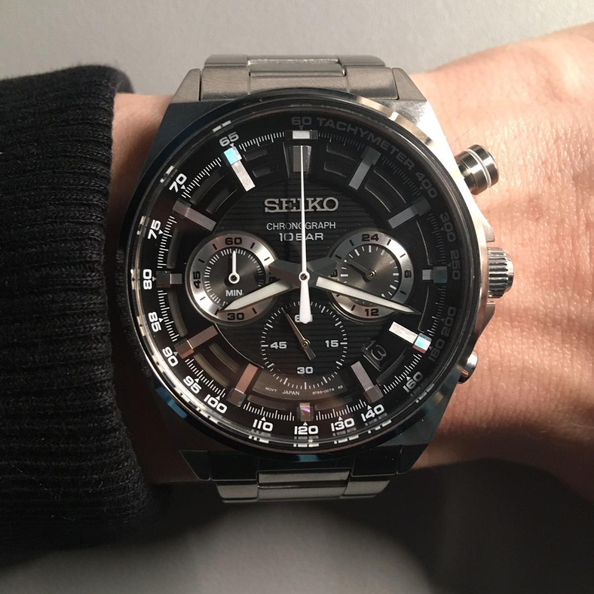 Часы оснащены кварцевым механизмом Seiko калибра 8T63 с точностью ±15 секунд в месяц и функцией хронографа до 60 минут с точностью 1/5 секунды.  Циферблат защищён минеральным стекломМинеральное стеклоМинеральное стекло представляет собой искусственно выращенный минерал кварца. Такое стекло отличается особой устойчивостью к повреждениям и царапинам. Уступает по некоторым качествам сапфировому стеклу. Hardlex, устойчивым к царапинам.  Установлена раскладная застёжкаРаскладная застёжкаТакой тип застёжки используется только на браслетах из металла. Она никогда не раскрывается полностью, происходит разделение на 2 и более частей. Раскладывающая застёжка снизит вероятность потери часов к минимуму. с тройным сгибом и кнопкой освобождения.  Модель обладает водонепроницаемостью до 100 метров, что делает её подходящей для плавания и сноркелинга.