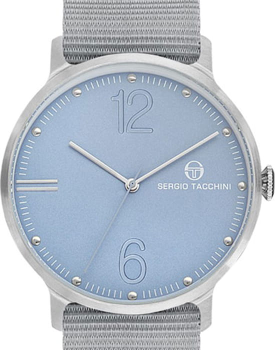 Sergio Tacchini — стильные мужские часы в минималистичном дизайне, подчеркивающем лёгкость и современность образа. Круглый корпус выполнен из нержавеющей стали, а циферблат оформлен крупными арабскими цифрами «6» и «12» и тонкими метками, что делает показания лёгкими для восприятия.
