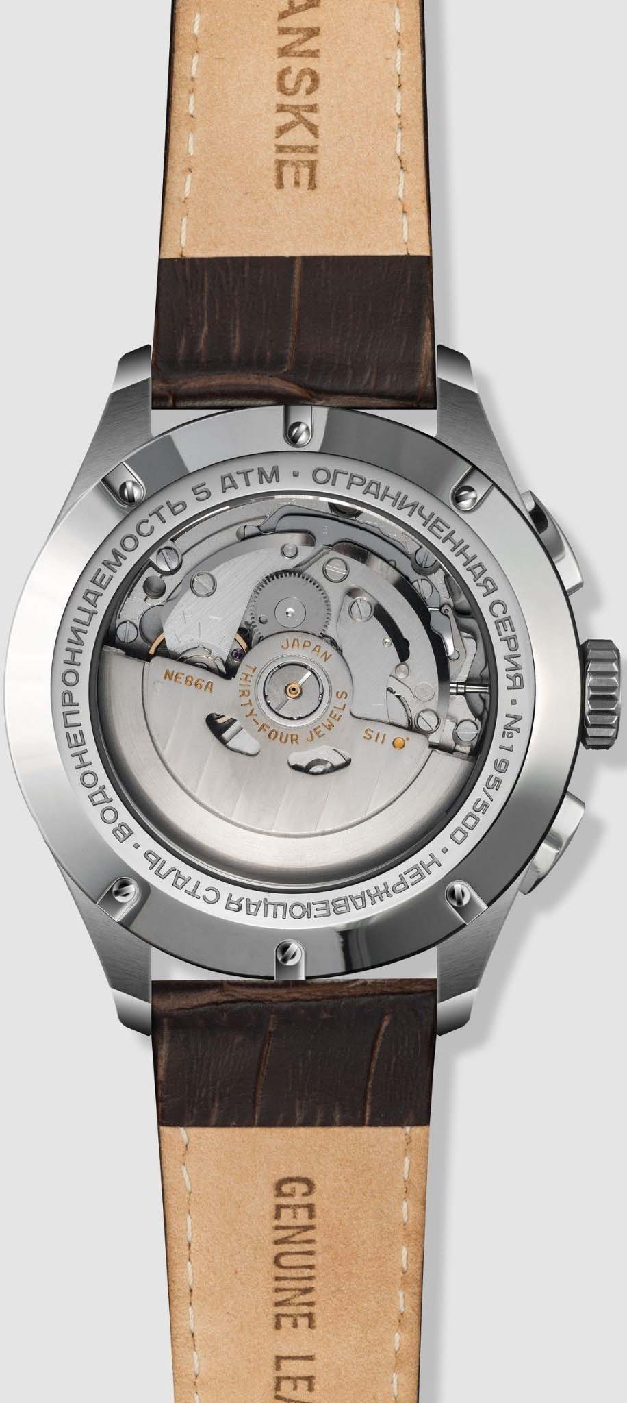 Мужские российские механические часы-хронографХронографФункция позволяет измерять отрезки времени с особой точностью: часы, минуты, секунды. Верным признаком хронографа является наличие на циферблате 3 дополнительных окошек-счётчиков. с секундомеромСекундомерСекундоме́р — прибор, способный измерять интервалы времени с точностью до долей секунды. Штурманские Открытый Космос NE86/1855018, механический механизм (автоматический калибр) с высокой точностью. Лимитированная серия - 500 экземпляров, посвящена первому выходу человека в открытый космос. Индивидуальная нумерация. Сапфировое стеклоСапфировое стеклоПрочный и надёжный материал из кристалла сапфира синтетического происхождения, характеризующийся особой твёрдостью и устойчивостью к царапинам и повреждениям. устойчивое к появлению царапин, обладающее высокой прозрачностью. Класс водозащиты: 50 метров, позволит защитить корпус от случайных брызг или капель дождя. Корпус часов изготовлен из стали. Кожаный ремешок на стандартной застёжке. Стрелки и метки с люминесцентным покрытиемЛюминесцентное покрытиеПозволяет считывать показания времени в темноте. Производители наносят на стрелки, часовые индексы, безель или поверхность циферблата светонакопительный состав, дающий холодное свечение.. Стальной корпус надежно защищает от повреждений механический японский калибр Seiko NE86 на 34 камня с запасом хода 42 часа. Подзавод у часов автоматический.
