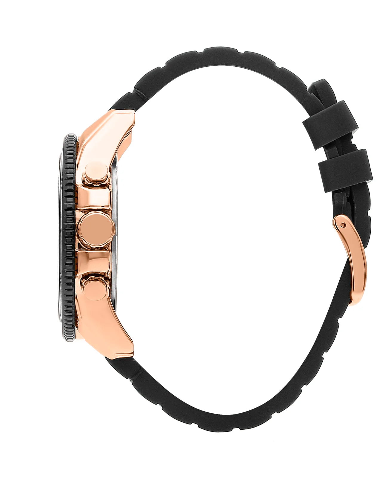 Мужские наручные часы Slazenger SL.09.2012.2.04 сочетают в себе спортивный дизайн и функциональность современных технологий. Модель обладает круглым корпусом диаметром 47 мм, изготовленным из суперметалла с IP-покрытиемIP-покрытиеМетод ионного напыления. Демонстрирует повышенную устойчивость к истиранию, окислению и химическим веществам. Под воздействием высокого давления и температуры около 1500°C молекулы металла надёжно соединяются с частицами корпуса часов., что обеспечивает высокую устойчивость к внешним воздействиям. Браслет выполнен из черного силикона, а застежка стандартная, гарантирующая комфортное ношение и безопасность. Черный циферблат дополнен индексами и тремя малыми циферблатами для отображения даты, дня недели и времени в формате 24 часа, а также защищен прочным минеральным стекломМинеральное стеклоМинеральное стекло представляет собой искусственно выращенный минерал кварца. Такое стекло отличается особой устойчивостью к повреждениям и царапинам. Уступает по некоторым качествам сапфировому стеклу. с люминесцентным покрытиемЛюминесцентное покрытиеПозволяет считывать показания времени в темноте. Производители наносят на стрелки, часовые индексы, безель или поверхность циферблата светонакопительный состав, дающий холодное свечение. для лучшей видимости в темноте. Часы работают на кварцевом механизме, что гарантирует точное время без необходимости подзаводки. БезельБезельВнешний ободок, закрепляющий стекло. В спортивных часах так называется поворотное кольцо с делениями на циферблате, выполняет роль таймера – замеряет отрезки времени на шкале. Неподвижный безель – элемент декора. Однонаправленно вращающийся безель на дайверских часах позволяет фиксировать моменты погружения и выныривания на поверхность. с IP-покрытиемIP-покрытиеМетод ионного напыления. Демонстрирует повышенную устойчивость к истиранию, окислению и химическим веществам. Под воздействием высокого давления и температуры около 1500°C молекулы металла надёжно соединяются с частицами корпуса часов.. Водонепроницаемость часов достигает уровня 5 атмосфер (WR50), что позволяет использовать их во время плавания, однако не рекомендуется для глубоководного дайвинга.