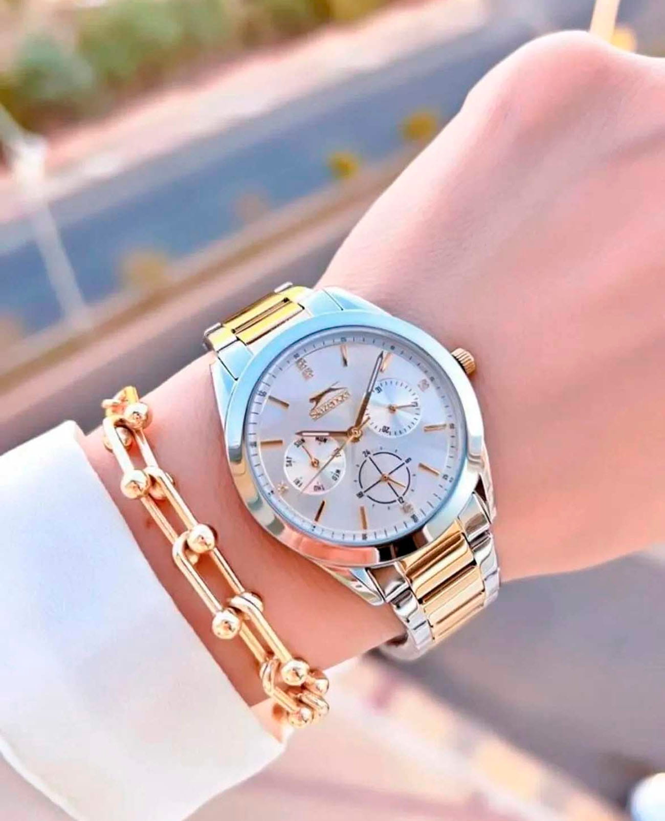 Женские наручные часы Slazenger SL.09.2032.4.04 сочетают в себе элегантный дизайн и надежность современных технологий. Модель обладает круглым корпусом диаметром 35 мм, изготовленным из суперметалла, что обеспечивает высокую устойчивость к внешним воздействиям. Браслет выполнен из того же материала с частичным IP-покрытиемIP-покрытиеМетод ионного напыления. Демонстрирует повышенную устойчивость к истиранию, окислению и химическим веществам. Под воздействием высокого давления и температуры около 1500°C молекулы металла надёжно соединяются с частицами корпуса часов.  на раскладной застёжкеРаскладная застёжкаТакой тип застёжки используется только на браслетах из металла. Она никогда не раскрывается полностью, происходит разделение на 2 и более частей. Раскладывающая застёжка снизит вероятность потери часов к минимуму.. Серебристый циферблат оснащен тремя стрелками для показания времени. Для защиты применяется минеральное стеклоМинеральное стеклоМинеральное стекло представляет собой искусственно выращенный минерал кварца. Такое стекло отличается особой устойчивостью к повреждениям и царапинам. Уступает по некоторым качествам сапфировому стеклу., обеспечивающее прочную защиту от царапин. Часы работают на кварцевом механизме, что гарантирует точное время без необходимости подзаводки. Водонепроницаемость часов достигает 3 атмосфер (30 метров), что позволяет использовать их при легком контакте с водой, например, во время мытья рук, но не рекомендуется для плавания.