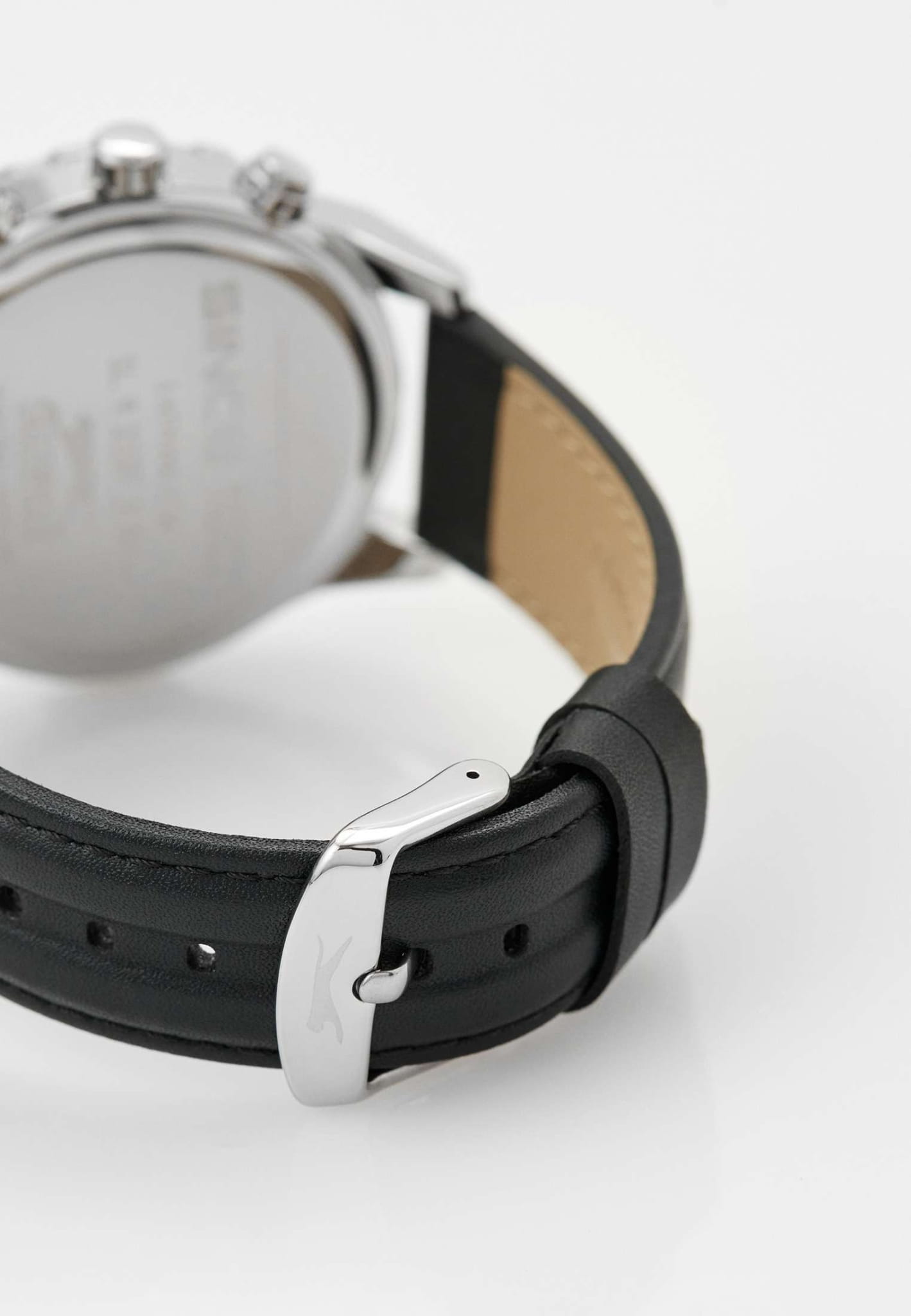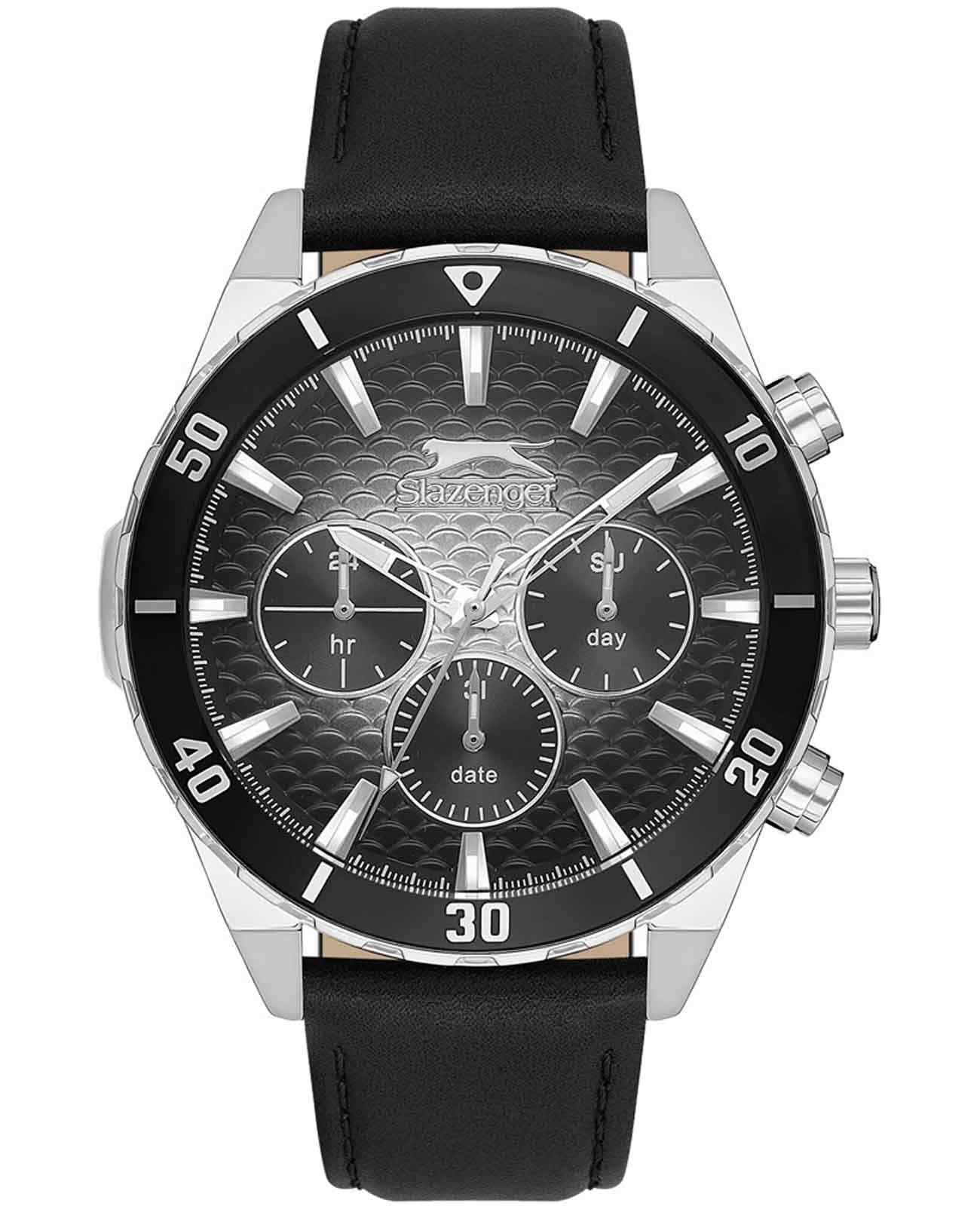 Часы Slazenger SL.09.2237.2.01 — это стильная и надежная модель, которая станет отличным выбором для активного современного мужчины. Крупный корпус диаметром 46 мм выполнен из прочного металла, а черный кожаный ремешок с классической застежкой, что обеспечивает комфорт при повседневном ношении. На безельБезельВнешний ободок, закрепляющий стекло. В спортивных часах так называется поворотное кольцо с делениями на циферблате, выполняет роль таймера – замеряет отрезки времени на шкале. Неподвижный безель – элемент декора. Однонаправленно вращающийся безель на дайверских часах позволяет фиксировать моменты погружения и выныривания на поверхность. нанесено черное IP-покрытиеIP-покрытиеМетод ионного напыления. Демонстрирует повышенную устойчивость к истиранию, окислению и химическим веществам. Под воздействием высокого давления и температуры около 1500°C молекулы металла надёжно соединяются с частицами корпуса часов.. Минеральное стеклоМинеральное стеклоМинеральное стекло представляет собой искусственно выращенный минерал кварца. Такое стекло отличается особой устойчивостью к повреждениям и царапинам. Уступает по некоторым качествам сапфировому стеклу. защищает текстурированный черно-белый циферблат с градиентом от случайных царапин, а водозащита уровня WR 50 позволяет не переживать о попадании влаги при контакте с водой. На циферблате расположены дополнительные малые циферблаты с отображением даты, дня недели и времени в 24-часовом формате, что делает использование часов максимально функциональным. Для удобства использования в темное время суток предусмотрено люминесцентное покрытиеЛюминесцентное покрытиеПозволяет считывать показания времени в темноте. Производители наносят на стрелки, часовые индексы, безель или поверхность циферблата светонакопительный состав, дающий холодное свечение. стрелок. Толщина корпуса составляет 12 мм, вес часов — 76 грамма.