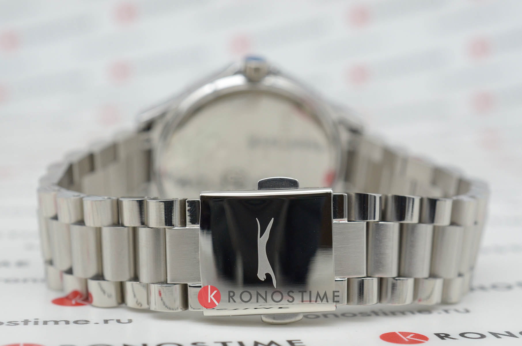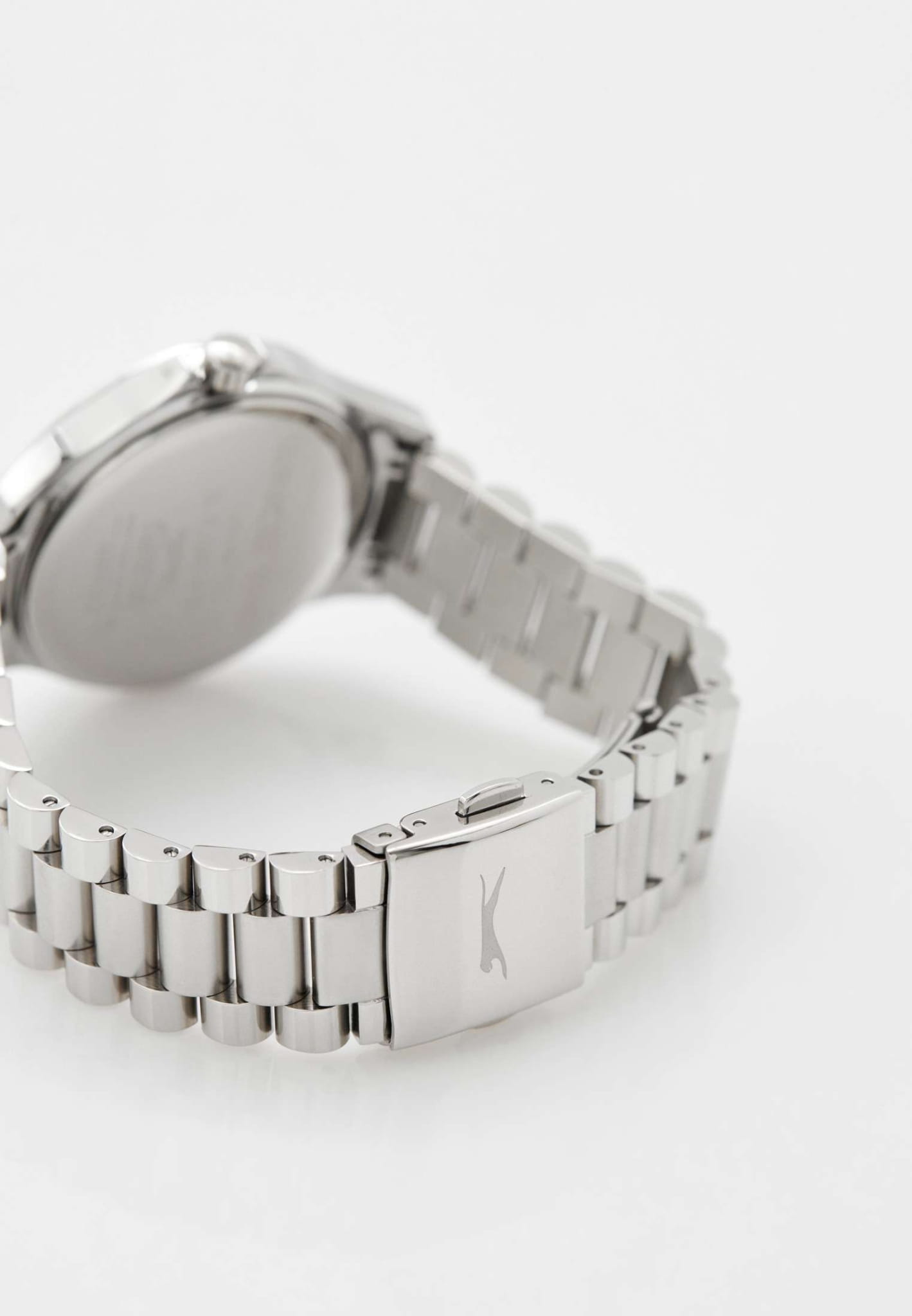 Эти женские часы Slazenger SL.09.2241.4.01 выполнены в современном стиле и станет элегантным дополнением к любому образу. Корпус и браслет изготовлены из прочного металла серебристого цвета, безельБезельВнешний ободок, закрепляющий стекло. В спортивных часах так называется поворотное кольцо с делениями на циферблате, выполняет роль таймера – замеряет отрезки времени на шкале. Неподвижный безель – элемент декора. Однонаправленно вращающийся безель на дайверских часах позволяет фиксировать моменты погружения и выныривания на поверхность. украшен изящными кристаллами, которые придают часам особую привлекательность. На циферблате расположены дополнительные малые циферблаты для отображения даты, дня недели и времени в 24-часовом формате, что делает их функциональными и удобными для ежедневного использования. Минеральное стеклоМинеральное стеклоМинеральное стекло представляет собой искусственно выращенный минерал кварца. Такое стекло отличается особой устойчивостью к повреждениям и царапинам. Уступает по некоторым качествам сапфировому стеклу. надежно защищает циферблат от царапин, а водозащита уровня WR 30 предохраняет механизм от случайных брызг воды. Заводная головка оснащена защитой, а стрелки имеют подсветку для легкого считывания времени в темноте. Диаметр корпуса составляет 34 мм, ширина браслета — 16 мм, толщина корпуса — 9 мм. Часы фиксируются на руке с помощью удобной раскладной застёжкиРаскладная застёжкаТакой тип застёжки используется только на браслетах из металла. Она никогда не раскрывается полностью, происходит разделение на 2 и более частей. Раскладывающая застёжка снизит вероятность потери часов к минимуму.. Вес изделия подобран для комфортной ежедневной носки. Для удобства использования в темное время суток предусмотрено люминесцентное покрытиеЛюминесцентное покрытиеПозволяет считывать показания времени в темноте. Производители наносят на стрелки, часовые индексы, безель или поверхность циферблата светонакопительный состав, дающий холодное свечение. стрелок.