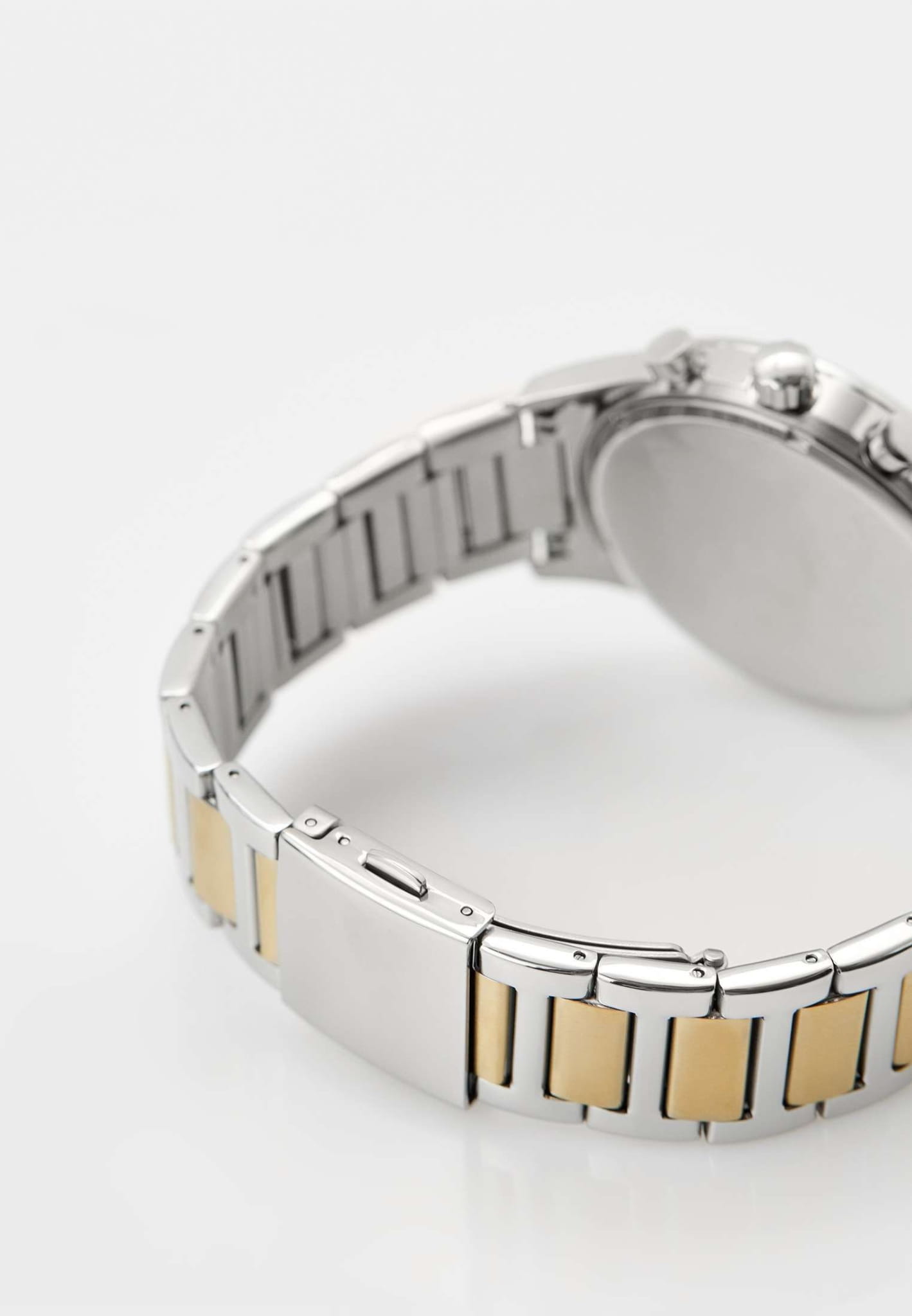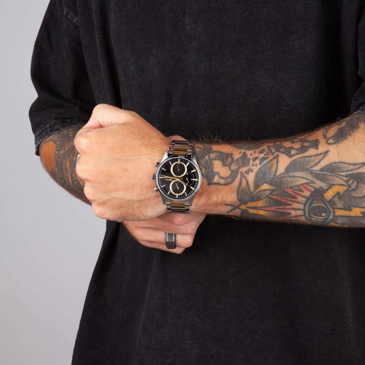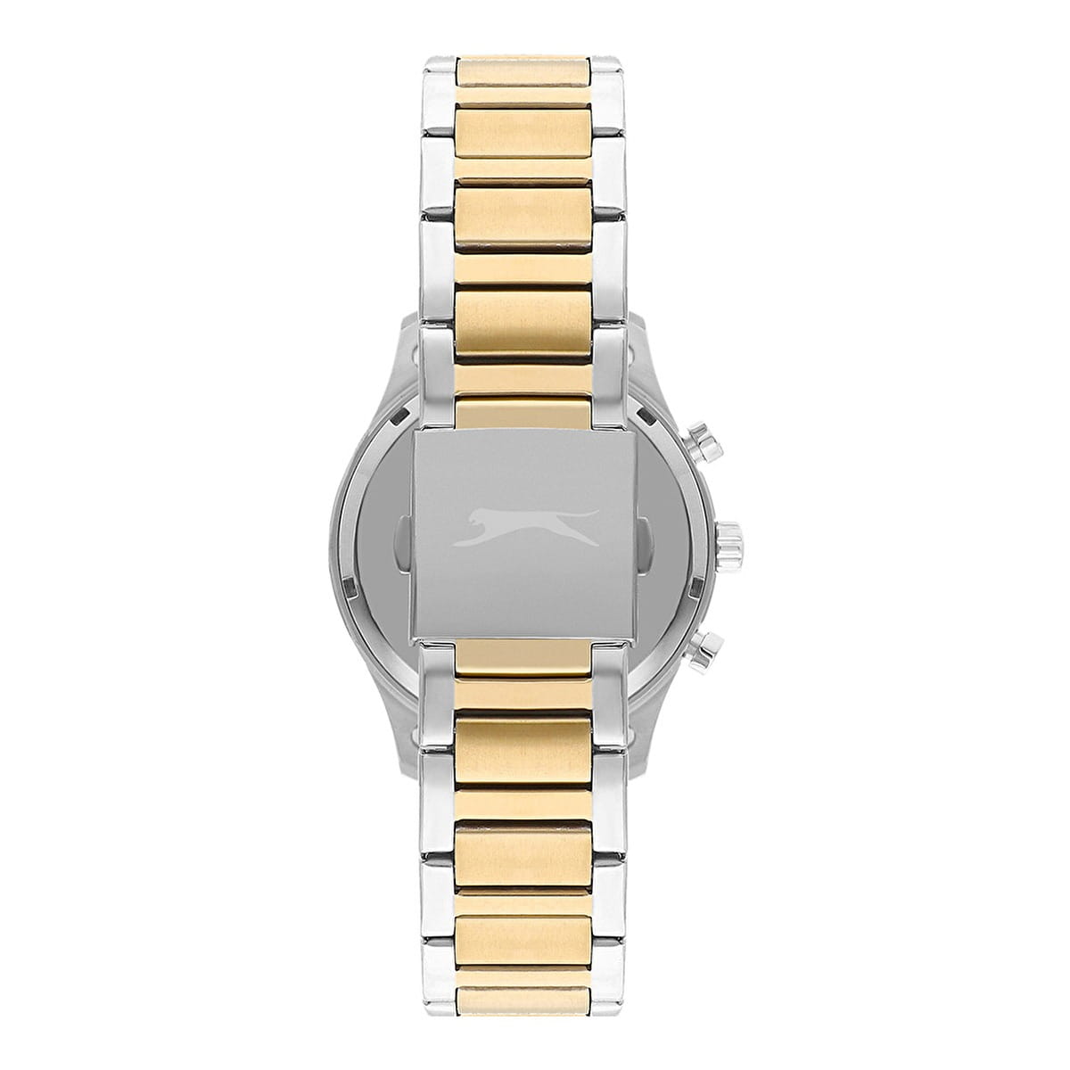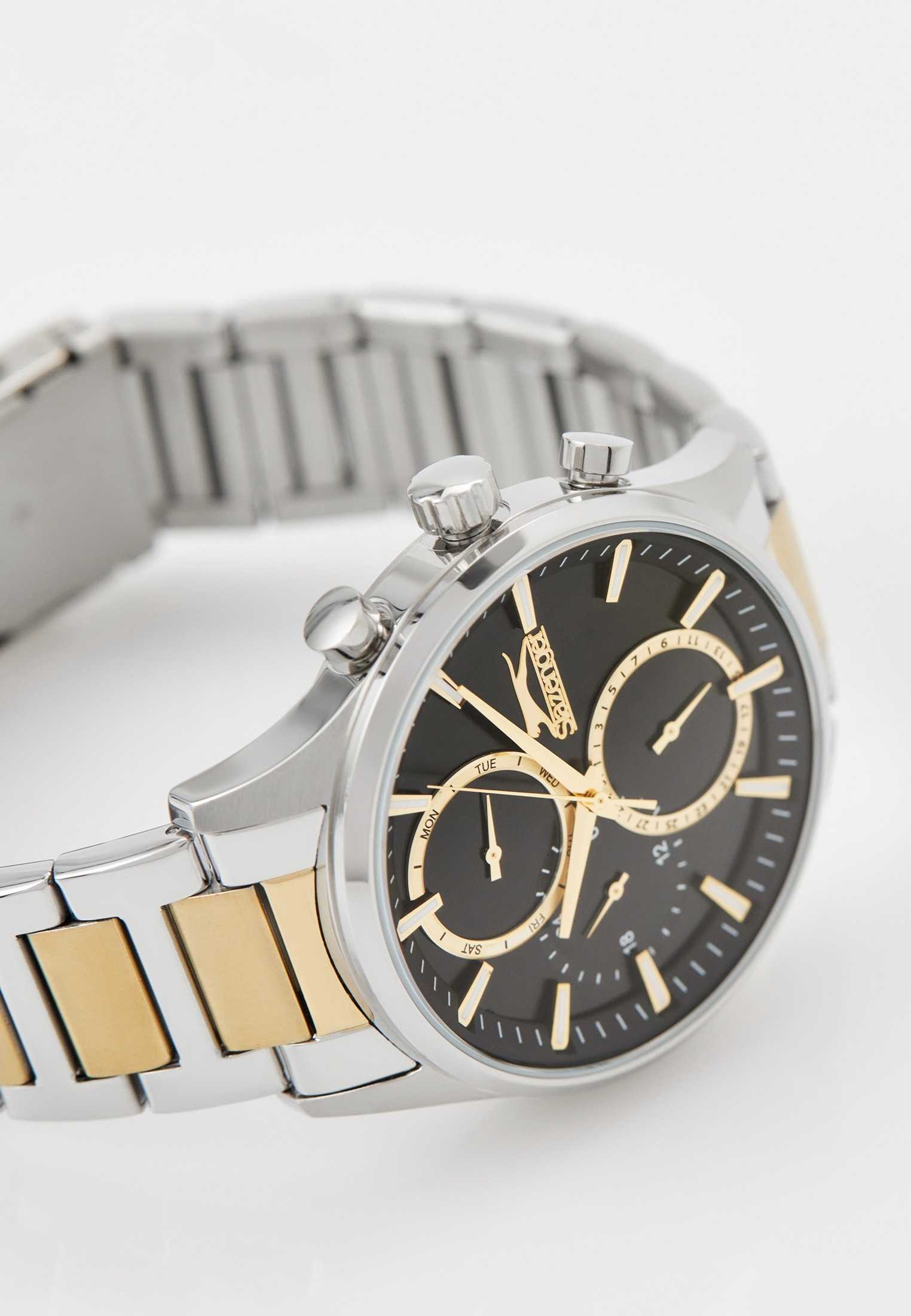 Часы Slazenger SL.09.2283.2.04 — это стильный и надежный аксессуар, который подчеркивает индивидуальность своего владельца. Корпус и браслет выполнены из прочного суперметалла — инновационного сплава на основе меди с пониженным содержанием цинка и никеля, дополненного специальным покрытием для долговечности и эстетики. Черный циферблат надежно защищен минеральным стекломМинеральное стеклоМинеральное стекло представляет собой искусственно выращенный минерал кварца. Такое стекло отличается особой устойчивостью к повреждениям и царапинам. Уступает по некоторым качествам сапфировому стеклу., устойчивым к царапинам и механическим повреждениям. Модель оснащена кварцевым механизмом, что гарантирует высокую точность хода. На отдельные циферблаты вынесены указатели 24-часового времени, даты и дня недели, что делает использование часов особенно удобным в повседневной жизни. Стальной браслет с частичным золотистым IP-покрытиемIP-покрытиеМетод ионного напыления. Демонстрирует повышенную устойчивость к истиранию, окислению и химическим веществам. Под воздействием высокого давления и температуры около 1500°C молекулы металла надёжно соединяются с частицами корпуса часов. и раскладной застёжкойРаскладная застёжкаТакой тип застёжки используется только на браслетах из металла. Она никогда не раскрывается полностью, происходит разделение на 2 и более частей. Раскладывающая застёжка снизит вероятность потери часов к минимуму. обеспечивает комфортную посадку. Водозащита 5 АТМ позволяет не беспокоиться о случайных брызгах или дожде. Метки с люминесцентным покрытиемЛюминесцентное покрытиеПозволяет считывать показания времени в темноте. Производители наносят на стрелки, часовые индексы, безель или поверхность циферблата светонакопительный состав, дающий холодное свечение. удобно подсвечиваются в темноте после зарядки на свету. Диаметр корпуса составляет 43 мм, толщина — 13 мм, что обеспечивает комфортное ношение на запястье. Часы станут отличным выбором для повседневного использования или дополнения к деловому образу, а также послужат отличным подарком на любой праздник.