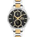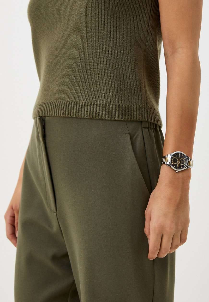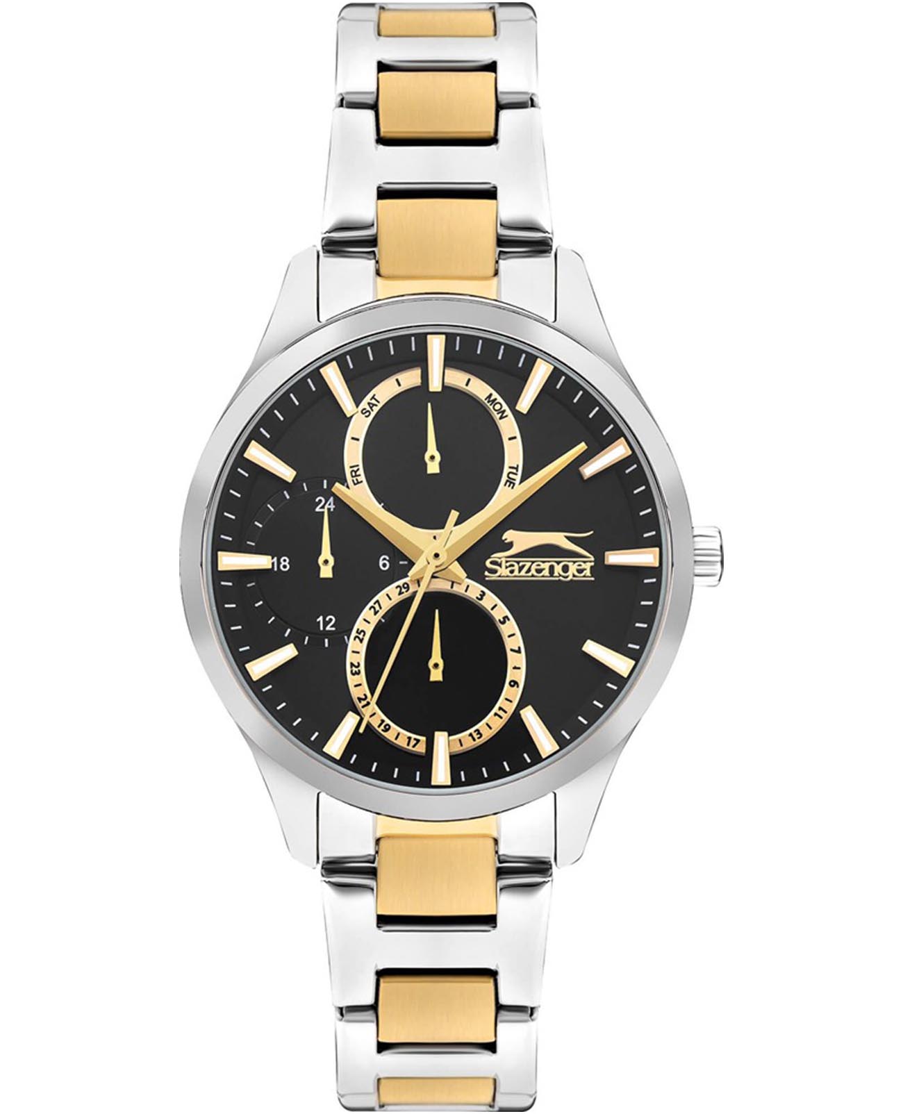Часы Slazenger SL.09.2284.4.04 — это изящный и функциональный аксессуар, который гармонично дополнит ваш образ и подчеркнет индивидуальность. Корпус и браслет выполнены из инновационного суперметалла — сплава на основе меди с пониженным содержанием цинка и никеля, что обеспечивает долговечность и надежную защиту от внешних воздействий. Черный циферблат, защищенный прочным минеральным стекломМинеральное стеклоМинеральное стекло представляет собой искусственно выращенный минерал кварца. Такое стекло отличается особой устойчивостью к повреждениям и царапинам. Уступает по некоторым качествам сапфировому стеклу., оснащен дополнительными индикаторами: отдельные циферблаты отображают 24-часовой формат времени, текущую дату и день недели, что делает использование часов максимально удобным в повседневной жизни. Диаметр корпуса составляет 35 мм, а толщина — 11 мм, благодаря чему модель комфортно располагается на запястье. Браслет с частичным золотистым IP-покрытиемIP-покрытиеМетод ионного напыления. Демонстрирует повышенную устойчивость к истиранию, окислению и химическим веществам. Под воздействием высокого давления и температуры около 1500°C молекулы металла надёжно соединяются с частицами корпуса часов. и раскладной застёжкойРаскладная застёжкаТакой тип застёжки используется только на браслетах из металла. Она никогда не раскрывается полностью, происходит разделение на 2 и более частей. Раскладывающая застёжка снизит вероятность потери часов к минимуму. обеспечивает комфортную посадку. Метки с люминесцентным покрытиемЛюминесцентное покрытиеПозволяет считывать показания времени в темноте. Производители наносят на стрелки, часовые индексы, безель или поверхность циферблата светонакопительный состав, дающий холодное свечение. удобно подсвечиваются в темноте после зарядки на свету. Класс водонепроницаемости 3 атм защищает механизм от случайных брызг и капель дождя. Кварцевый механизм гарантирует точность хода и простоту эксплуатации.