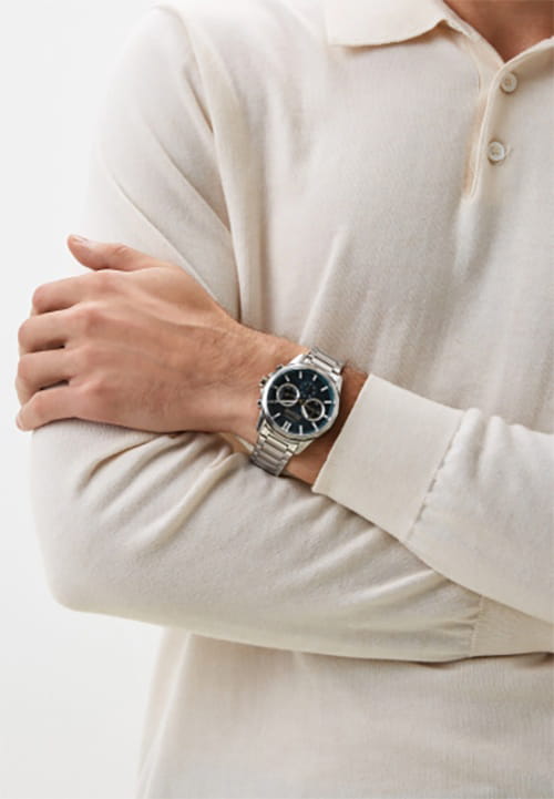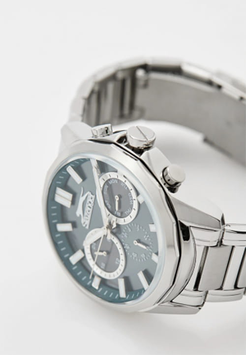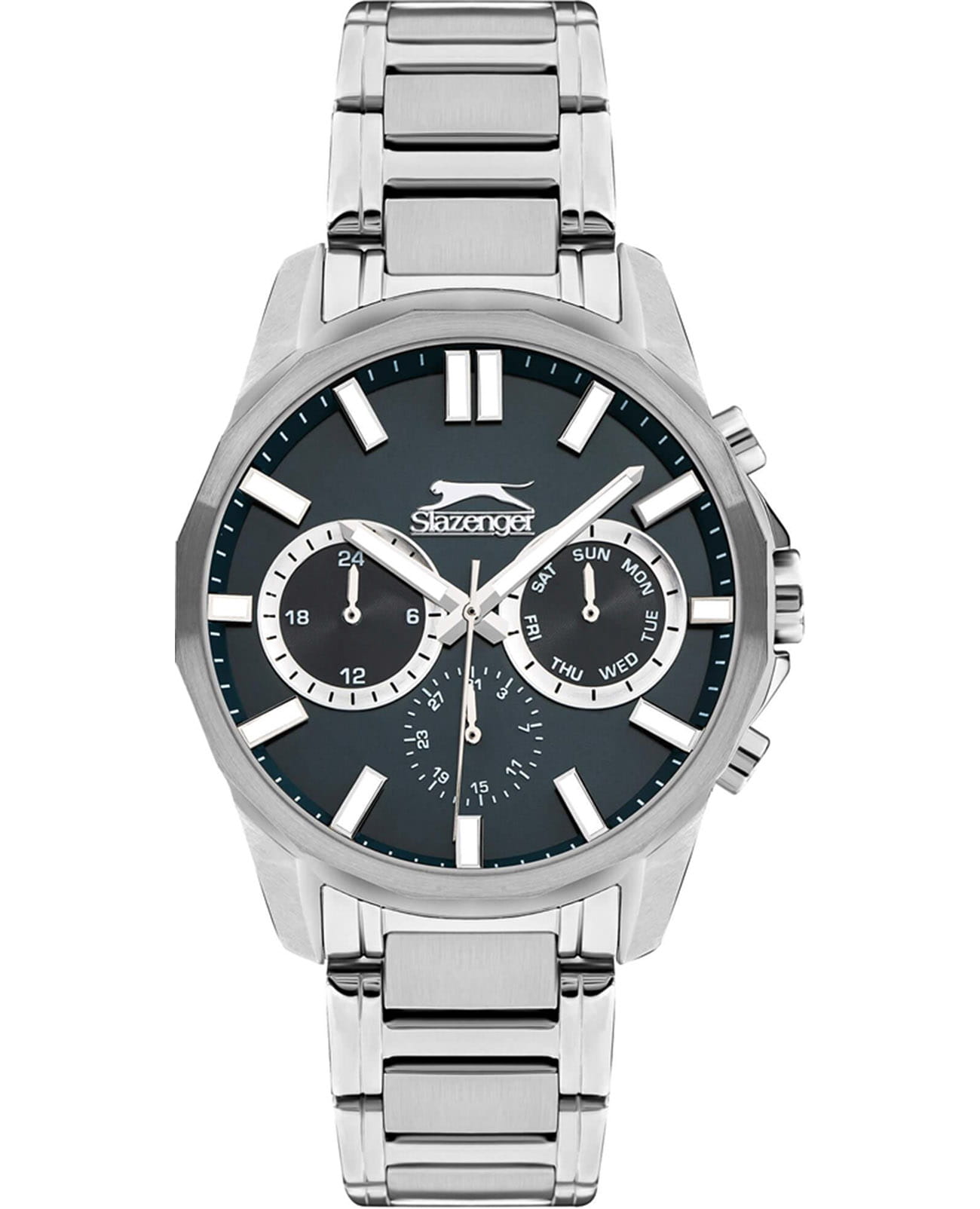 Мужские кварцевые часы Slazenger SL.09.2300.2.04 — это выразительный и функциональный аксессуар, сочетающий прочность, стиль и насыщенную комплектацию. Корпус и браслет выполнены из суперметалла, защищён минеральным стекломМинеральное стеклоМинеральное стекло представляет собой искусственно выращенный минерал кварца. Такое стекло отличается особой устойчивостью к повреждениям и царапинам. Уступает по некоторым качествам сапфировому стеклу.. Циферблат синего цвета оформлен с вынесенными малыми циферблатами для индикации дня недели, даты и времени в 24-часовом формате. Заводная головка снабжена защитой, а задняя крышка — завинчивающаяся, что обеспечивает повышенную надёжность конструкции. Стрелки оснащены люминесцентным покрытиемЛюминесцентное покрытиеПозволяет считывать показания времени в темноте. Производители наносят на стрелки, часовые индексы, безель или поверхность циферблата светонакопительный состав, дающий холодное свечение., обеспечивающим хорошую читаемость в темноте. Браслет фиксируется на раскладной застёжкеРаскладная застёжкаТакой тип застёжки используется только на браслетах из металла. Она никогда не раскрывается полностью, происходит разделение на 2 и более частей. Раскладывающая застёжка снизит вероятность потери часов к минимуму., обеспечивая удобство и безопасность ношения. Водонепроницаемость 50 м позволяет использовать часы в повседневных условиях, защищая от случайных брызг и капель дождя. Модель подчёркивает индивидуальность владельца и идеально подходит как для повседневного, так и для делового образа.