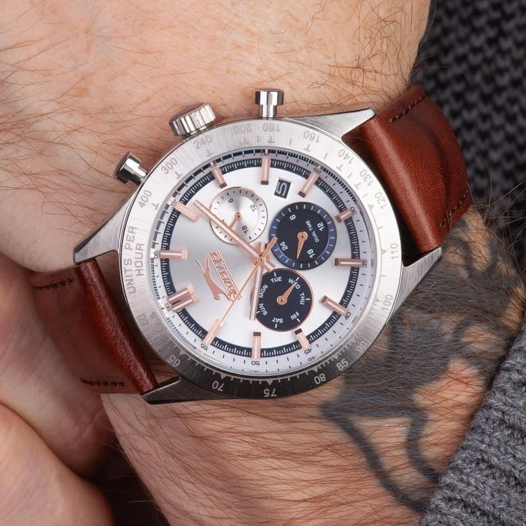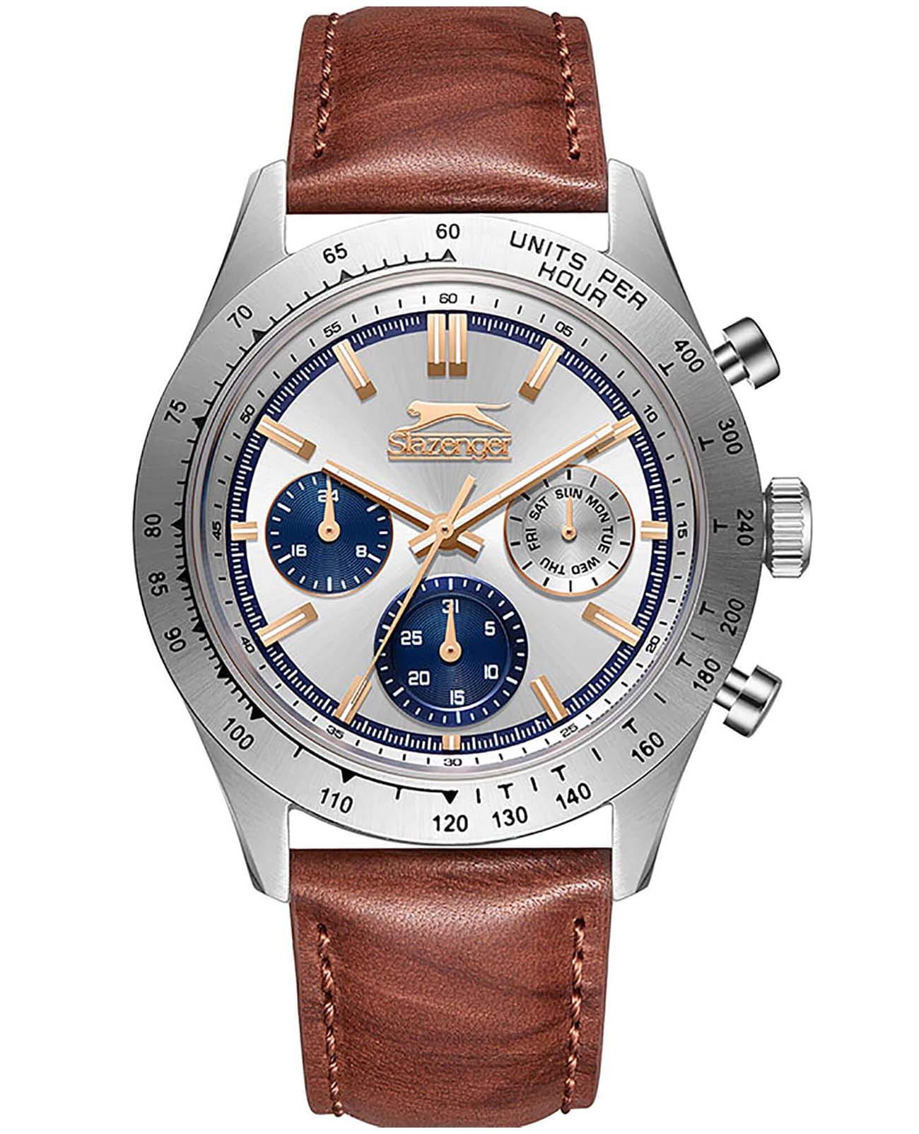 Мужские кварцевые часы Slazenger SL.09.2359.2.04 – идеальное сочетание классического дизайна и современных технологий, созданное для уверенных в себе мужчин. Корпус выполнен из суперметалла серебристого цвета, диаметром 43 мм и толщиной 11 мм, подчёркивает надежность модели и делает их идеальным аксессуаром для любой ситуации – будь то деловая встреча или повседневные выходы. Циферблат надёжно защищён минеральным стекломМинеральное стеклоМинеральное стекло представляет собой искусственно выращенный минерал кварца. Такое стекло отличается особой устойчивостью к повреждениям и царапинам. Уступает по некоторым качествам сапфировому стеклу., которое устойчиво к механическим повреждениям и сохраняет кристальную прозрачность. Кожаный ремешок на стандартной застёжке удобно облегает запястье, обеспечивая надёжность и комфорт в повседневном ношении. Стрелки покрыты люминесцентным покрытиемЛюминесцентное покрытиеПозволяет считывать показания времени в темноте. Производители наносят на стрелки, часовые индексы, безель или поверхность циферблата светонакопительный состав, дающий холодное свечение., обеспечивающим отличную читаемость в темноте. Эти часы станут не просто аксессуаром, а надежным спутником в любой ситуации, подчеркивая ваш безупречный вкус и деловой стиль. Вынесенный циферблат с 24-х часовым указателем времени и функция тахиметраТахиметрРазмеченная шкала, располагается на ободке или безеле часов. Тахиметр позволяет рассчитать скорость на определённом участке пути, расстояние измеряется в километрах или милях.. Водозащита 50 метров позволит защитить корпус от случайных брызг или капель дождя.