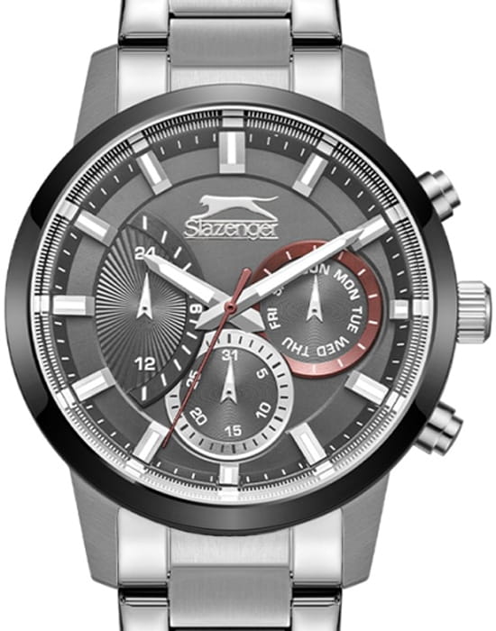 Slazenger (SL.09.2372.2.01) — стильные мужские часы, сочетающие современный дизайн и функциональность. Корпус выполнен из суперметалла, придающей модели прочность и долговечность. Минеральное стеклоМинеральное стеклоМинеральное стекло представляет собой искусственно выращенный минерал кварца. Такое стекло отличается особой устойчивостью к повреждениям и царапинам. Уступает по некоторым качествам сапфировому стеклу. защищает циферблат от царапин и гарантирует превосходную читаемость. БезельБезельВнешний ободок, закрепляющий стекло. В спортивных часах так называется поворотное кольцо с делениями на циферблате, выполняет роль таймера – замеряет отрезки времени на шкале. Неподвижный безель – элемент декора. Однонаправленно вращающийся безель на дайверских часах позволяет фиксировать моменты погружения и выныривания на поверхность. с PVD-покрытиемPVDУльтратонкое покрытие наносится в технике вакуумного напыления, сочетает в себе нитрид титана особой прочности со слоем золота или оксида хрома. Несёт в себе декоративную или защитную функцию.. Циферблат с серебристыми метками и стрелками подчёркивает элегантный стиль. Браслет из суперметалла обеспечивает комфортное ношение и надёжную фиксацию на запястье. Функциональность дополняется многофункциональным дисплеем с индикацией даты, дня недели и 24-часового формата времени. Водонепроницаемость 50 метров делает модель устойчивой к случайным брызгам, идеально подходя для повседневного использования.