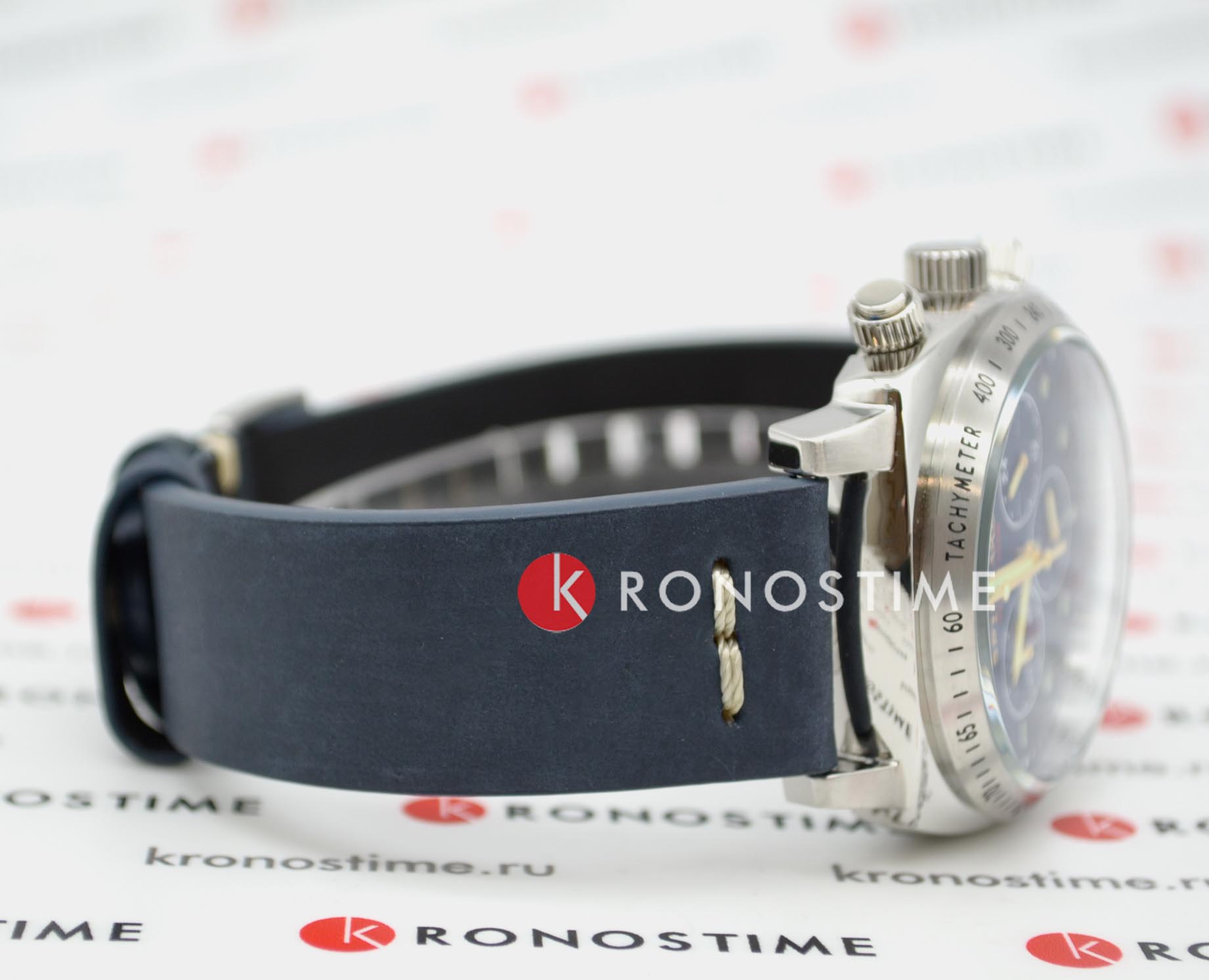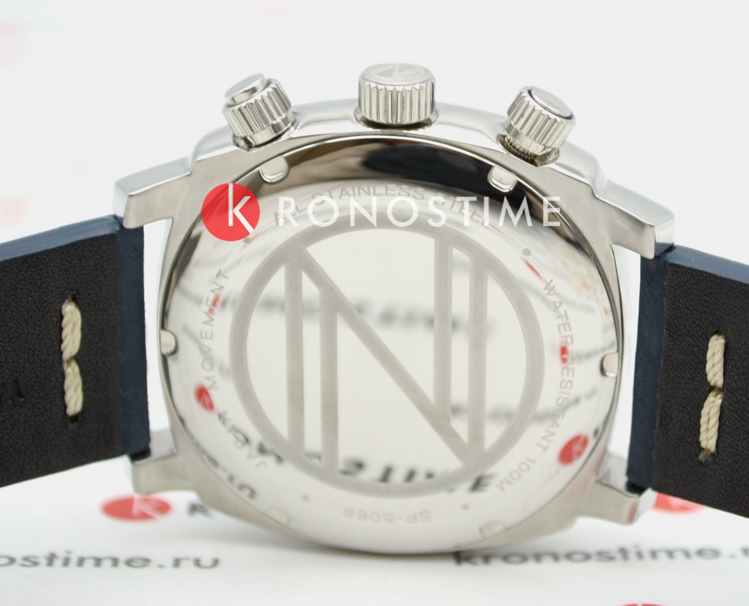 Мужской кварцевый хронографХронографФункция позволяет измерять отрезки времени с особой точностью: часы, минуты, секунды. Верным признаком хронографа является наличие на циферблате 3 дополнительных окошек-счётчиков. с секундомеромСекундомерСекундоме́р — прибор, способный измерять интервалы времени с точностью до долей секунды. и тахиметромТахиметрРазмеченная шкала, располагается на ободке или безеле часов. Тахиметр позволяет рассчитать скорость на определённом участке пути, расстояние измеряется в километрах или милях. Spinnaker Hull SP-5068-03. Калибр механизма TMI VK73. Центральные часовая и минутная стрелки, секундная стрелка вынесена на малый циферблат. Большая дата в позиции 12 часов. 12/24х часовой формат времени. Корпус выполнен из нержавеющей стали. Кожаный ремешок шириной 22 мм, стандартная застежка. Циферблат с люминесцентным покрытиемЛюминесцентное покрытиеПозволяет считывать показания времени в темноте. Производители наносят на стрелки, часовые индексы, безель или поверхность циферблата светонакопительный состав, дающий холодное свечение. стрелок и меток, дополнен выпуклым минеральным стекломМинеральное стеклоМинеральное стекло представляет собой искусственно выращенный минерал кварца. Такое стекло отличается особой устойчивостью к повреждениям и царапинам. Уступает по некоторым качествам сапфировому стеклу. , устойчивым к мелким механическим повреждениям. Водостойкость WR 100 (плавание без погружения).