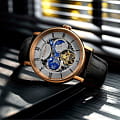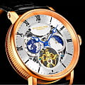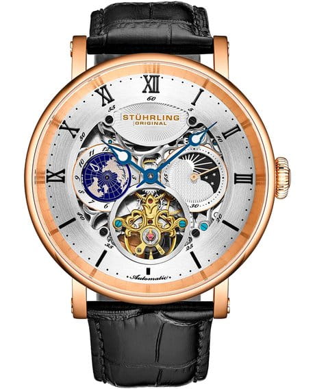 Мужские наручные часы Stuhrling Original 1015.04 — это уникальное сочетание классического стиля и современных технологий, предназначенное для ценителей точности и элегантности . Модель оснащена механическим механизмом с автоподзаводом, что обеспечивает высокую точность хода без необходимости ручного завода . Корпус часов диаметром 47 мм изготовлен из нержавеющей стали с PVD-покрытиемPVDУльтратонкое покрытие наносится в технике вакуумного напыления, сочетает в себе нитрид титана особой прочности со слоем золота или оксида хрома. Несёт в себе декоративную или защитную функцию., а его защиту обеспечивает особо прочное стекло KrysternaKrysternaKrysterna — инновационное стекло для наручных часов. Благодаря уникальной структуре, Krysterna объединяет ключевые преимущества двух материалов: твердость сапфира, защищающую от царапин, и гибкость минерального стекла, обеспечивающую устойчивость к деформациям. Такая комбинация делает его идеальным решением для часов, подверженных экстремальным нагрузкам, сохраняя при этом оптическую прозрачность.. Этот материал, используемый в производстве очковых линз высшей категории, отличается повышенной устойчивостью к царапинам и механическим повреждениям . Циферблат выполнен в стиле , что позволяет наблюдать за работой внутреннего механизма и подчеркивает сложность инженерного решения. Такой дизайн делает модель не только функциональной, но и стильной, привлекая внимание ценителей сложных технических решений . Часы обладают водонепроницаемостью до 50 метров (5 атмосфер), что позволяет использовать их в повседневных условиях, включая контакт с водой, например, при мытье рук или дожде . Заводная головка с системой завинчивания гарантирует дополнительную защиту механизма от внешних воздействий. Водонепроницаемость и надежный механизм делают эту модель идеальным выбором для тех, кто ценит как элегантность, так и практичность в повседневной жизни.