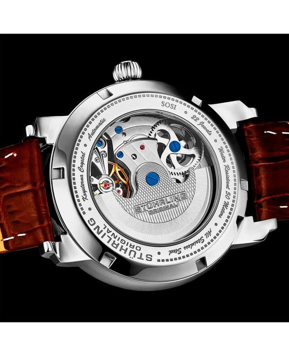 Мужские наручные часы Stührling Original 1017.02 из серии представляют собой элегантное сочетание классического стиля и современных технологий . Корпус часов диаметром 44 мм изготовлен из полированной и матовой нержавеющей стали, что обеспечивает высокую устойчивость к внешним воздействиям . Защиту циферблата обеспечивает прочное стекло KrysternaKrysternaKrysterna — инновационное стекло для наручных часов. Благодаря уникальной структуре, Krysterna объединяет ключевые преимущества двух материалов: твердость сапфира, защищающую от царапин, и гибкость минерального стекла, обеспечивающую устойчивость к деформациям. Такая комбинация делает его идеальным решением для часов, подверженных экстремальным нагрузкам, сохраняя при этом оптическую прозрачность., известное своей устойчивостью к царапинам и механическим повреждениям. Циферблат выполнен в стиле , что позволяет наблюдать за работой внутреннего механизма и подчеркивает сложность инженерного решения. Такой дизайн делает модель не только функциональной, но и стильной, привлекая внимание ценителей сложных технических решений . Часы обладают водонепроницаемостью до 50 метров (5 атмосфер), что позволяет использовать их в повседневных условиях, включая контакт с водой, например, при мытье рук или дожде . Заводная головка с системой завинчивания обеспечивает дополнительную защиту механизма от внешних воздействий.