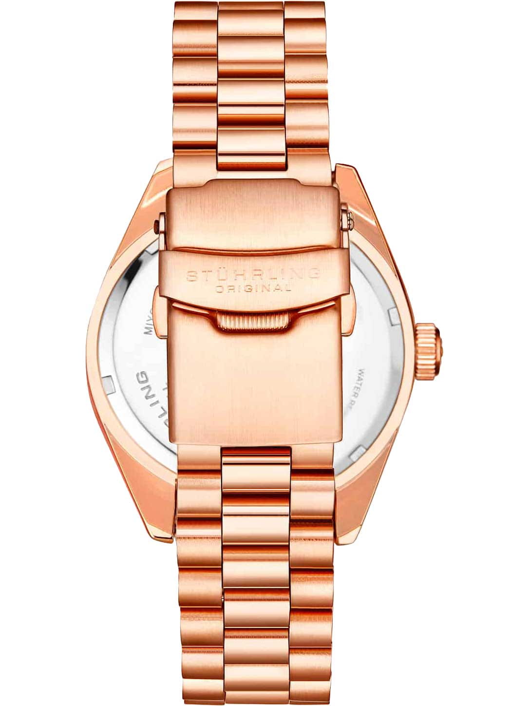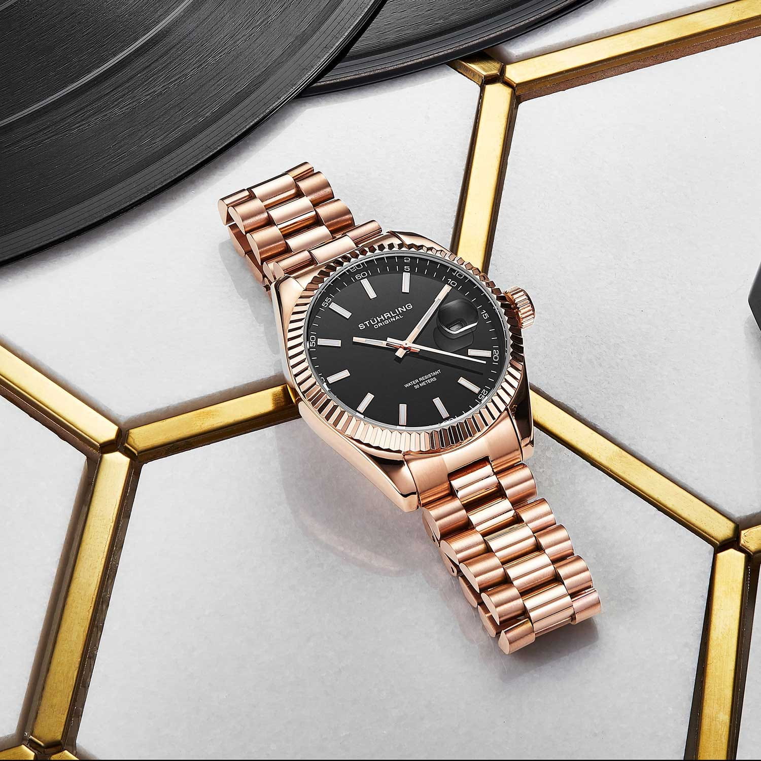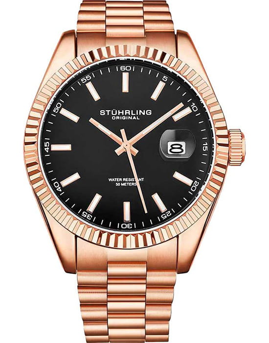 Stuhrling 3935.4 — элегантные мужские часы, объединяющие строгую классику и современную функциональность. Корпус из нержавеющей стали с PVD-покрытиемPVDУльтратонкое покрытие наносится в технике вакуумного напыления, сочетает в себе нитрид титана особой прочности со слоем золота или оксида хрома. Несёт в себе декоративную или защитную функцию. создают ощущение монолитной надёжности, а глубокий циферблат придаёт модели выразительность и характер. Стальной браслет с PVD-покрытиемPVDУльтратонкое покрытие наносится в технике вакуумного напыления, сочетает в себе нитрид титана особой прочности со слоем золота или оксида хрома. Несёт в себе декоративную или защитную функцию. на раскладной застёжкеРаскладная застёжкаТакой тип застёжки используется только на браслетах из металла. Она никогда не раскрывается полностью, происходит разделение на 2 и более частей. Раскладывающая застёжка снизит вероятность потери часов к минимуму. обеспечивает комфорт. Крупные метки и стрелки с люминесцентным покрытиемЛюминесцентное покрытиеПозволяет считывать показания времени в темноте. Производители наносят на стрелки, часовые индексы, безель или поверхность циферблата светонакопительный состав, дающий холодное свечение. обеспечивают идеальную читаемость даже в темноте. На позиции «3 часов» расположено аккуратное окно даты, подчёркивающее симметрию дизайна. Прочное стекло Krysterna защищает циферблат от царапин, а надёжный кварцевый механизм гарантирует стабильную точность. Stuhrling — выбор уверенного мужчины, ценящего сочетание функциональности, лаконичного дизайна и безупречной отделки.