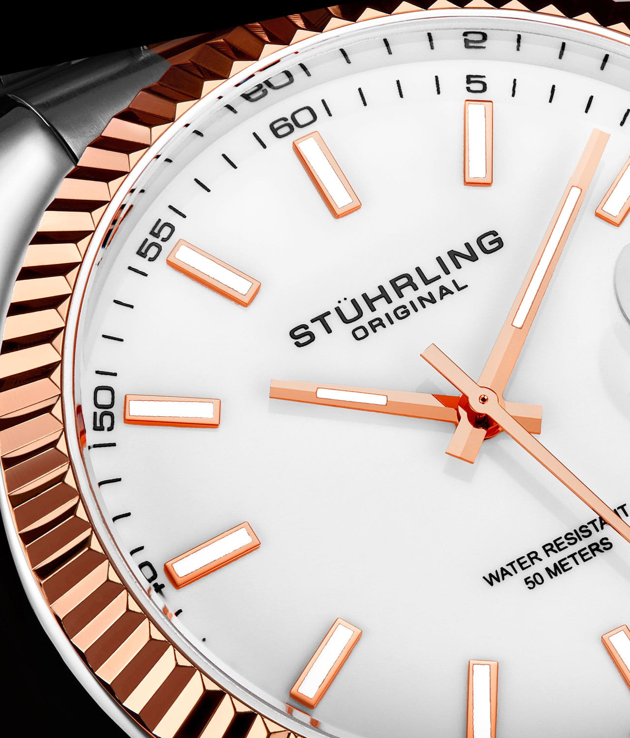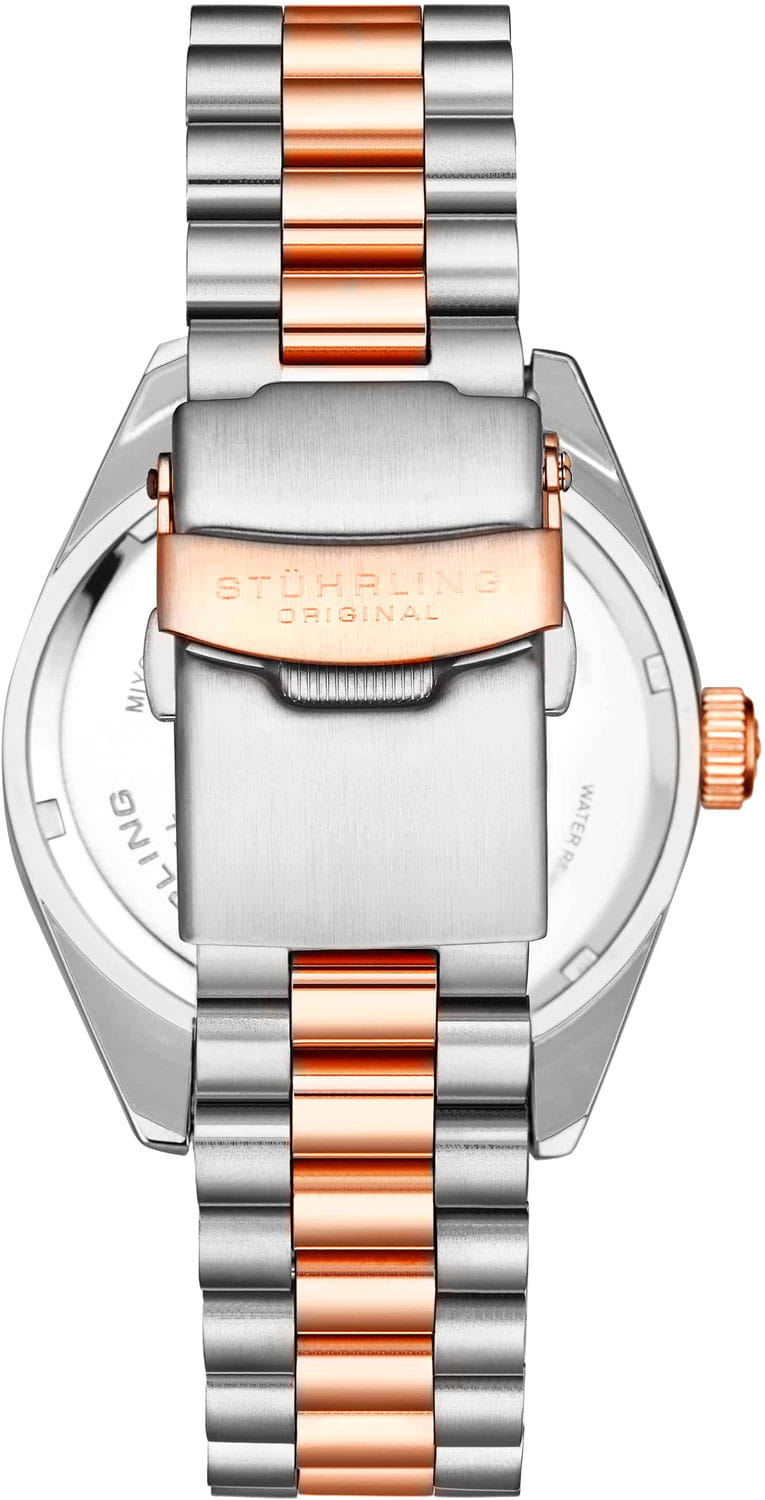 Stuhrling 3935.5 — элегантные мужские часы, объединяющие строгую классику и современную функциональность. Корпус из нержавеющей стали создают ощущение монолитной надёжности, а глубокий циферблат придаёт модели выразительность и характер. БезельБезельВнешний ободок, закрепляющий стекло. В спортивных часах так называется поворотное кольцо с делениями на циферблате, выполняет роль таймера – замеряет отрезки времени на шкале. Неподвижный безель – элемент декора. Однонаправленно вращающийся безель на дайверских часах позволяет фиксировать моменты погружения и выныривания на поверхность. с PVD-покрытиемPVDУльтратонкое покрытие наносится в технике вакуумного напыления, сочетает в себе нитрид титана особой прочности со слоем золота или оксида хрома. Несёт в себе декоративную или защитную функцию.. Стальной браслет с PVD-покрытиемPVDУльтратонкое покрытие наносится в технике вакуумного напыления, сочетает в себе нитрид титана особой прочности со слоем золота или оксида хрома. Несёт в себе декоративную или защитную функцию. на раскладной застёжкеРаскладная застёжкаТакой тип застёжки используется только на браслетах из металла. Она никогда не раскрывается полностью, происходит разделение на 2 и более частей. Раскладывающая застёжка снизит вероятность потери часов к минимуму. обеспечивает комфорт. Крупные метки и стрелки с люминесцентным покрытиемЛюминесцентное покрытиеПозволяет считывать показания времени в темноте. Производители наносят на стрелки, часовые индексы, безель или поверхность циферблата светонакопительный состав, дающий холодное свечение. обеспечивают идеальную читаемость даже в темноте. На позиции «3 часов» расположено аккуратное окно даты, подчёркивающее симметрию дизайна. Прочное стекло Krysterna защищает циферблат от царапин, а надёжный кварцевый механизм гарантирует стабильную точность. Stuhrling — выбор уверенного мужчины, ценящего сочетание функциональности, лаконичного дизайна и безупречной отделки.