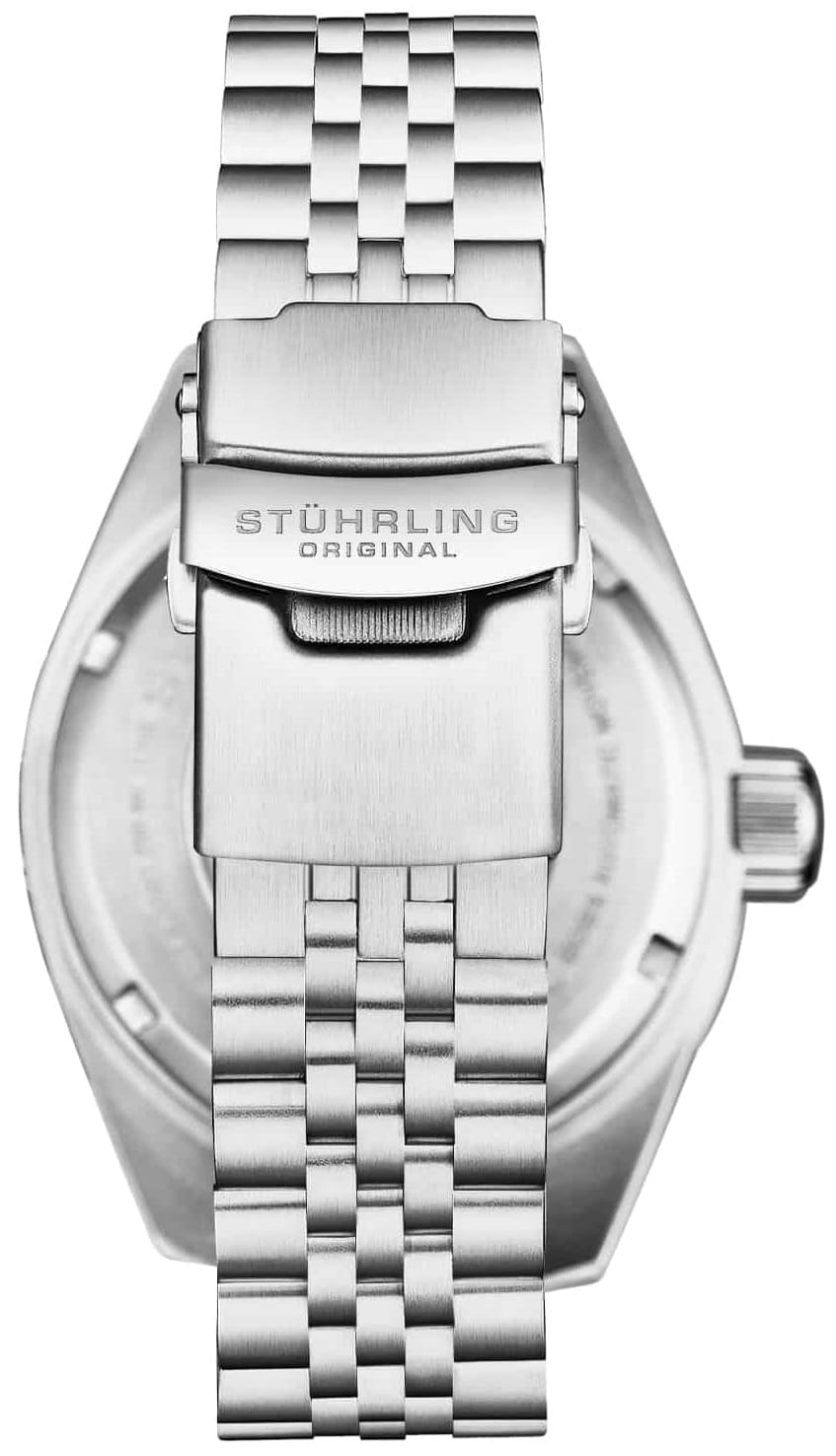 Stuhrling 4045.2 — надёжные мужские механические часы в стиле профессионального дайвера, сочетающие мощный дизайн и техническую точность. Корпус из нержавеющей стали с однонаправленным безелемБезельВнешний ободок, закрепляющий стекло. В спортивных часах так называется поворотное кольцо с делениями на циферблате, выполняет роль таймера – замеряет отрезки времени на шкале. Неподвижный безель – элемент декора. Однонаправленно вращающийся безель на дайверских часах позволяет фиксировать моменты погружения и выныривания на поверхность. с PVD-покрытиемPVDУльтратонкое покрытие наносится в технике вакуумного напыления, сочетает в себе нитрид титана особой прочности со слоем золота или оксида хрома. Несёт в себе декоративную или защитную функцию. и крупной заводной головкой подчёркивает инструментальный характер модели. Циферблат с контрастными стрелками и метками, покрытыми люминесцентным составомЛюминесцентное покрытиеПозволяет считывать показания времени в темноте. Производители наносят на стрелки, часовые индексы, безель или поверхность циферблата светонакопительный состав, дающий холодное свечение., обеспечивает отличную читаемость даже под водой. Прочное стекло KrysternaKrysternaKrysterna — инновационное стекло для наручных часов. Благодаря уникальной структуре, Krysterna объединяет ключевые преимущества двух материалов: твердость сапфира, защищающую от царапин, и гибкость минерального стекла, обеспечивающую устойчивость к деформациям. Такая комбинация делает его идеальным решением для часов, подверженных экстремальным нагрузкам, сохраняя при этом оптическую прозрачность. защищает от царапин, а стальной браслет с раскладной застёжкойРаскладная застёжкаТакой тип застёжки используется только на браслетах из металла. Она никогда не раскрывается полностью, происходит разделение на 2 и более частей. Раскладывающая застёжка снизит вероятность потери часов к минимуму. обеспечивает надёжную фиксацию и комфортное прилегание к запястью. Stuhrling — выбор для тех, кто ценит функциональность, стиль и уверенность в любой среде.