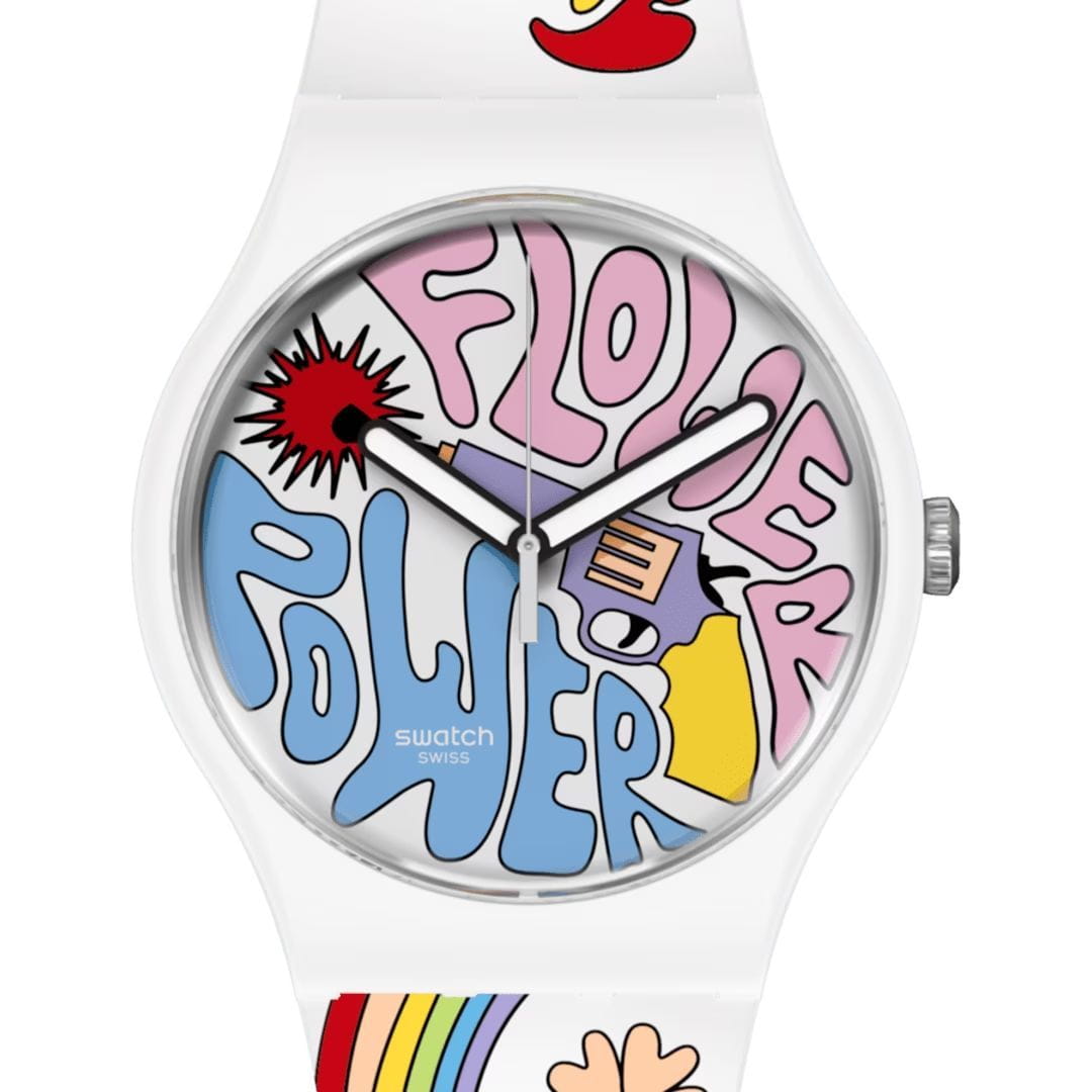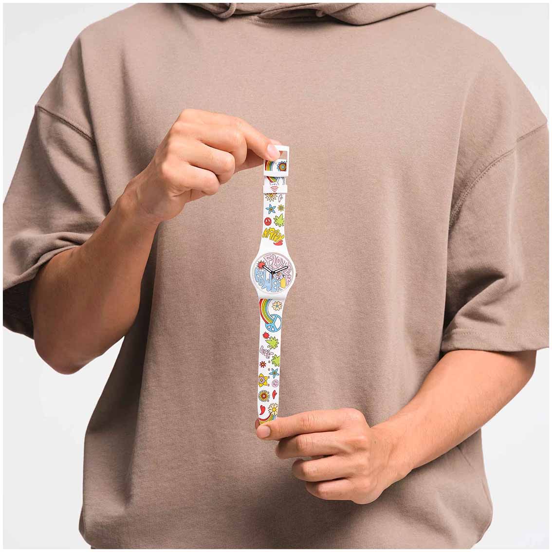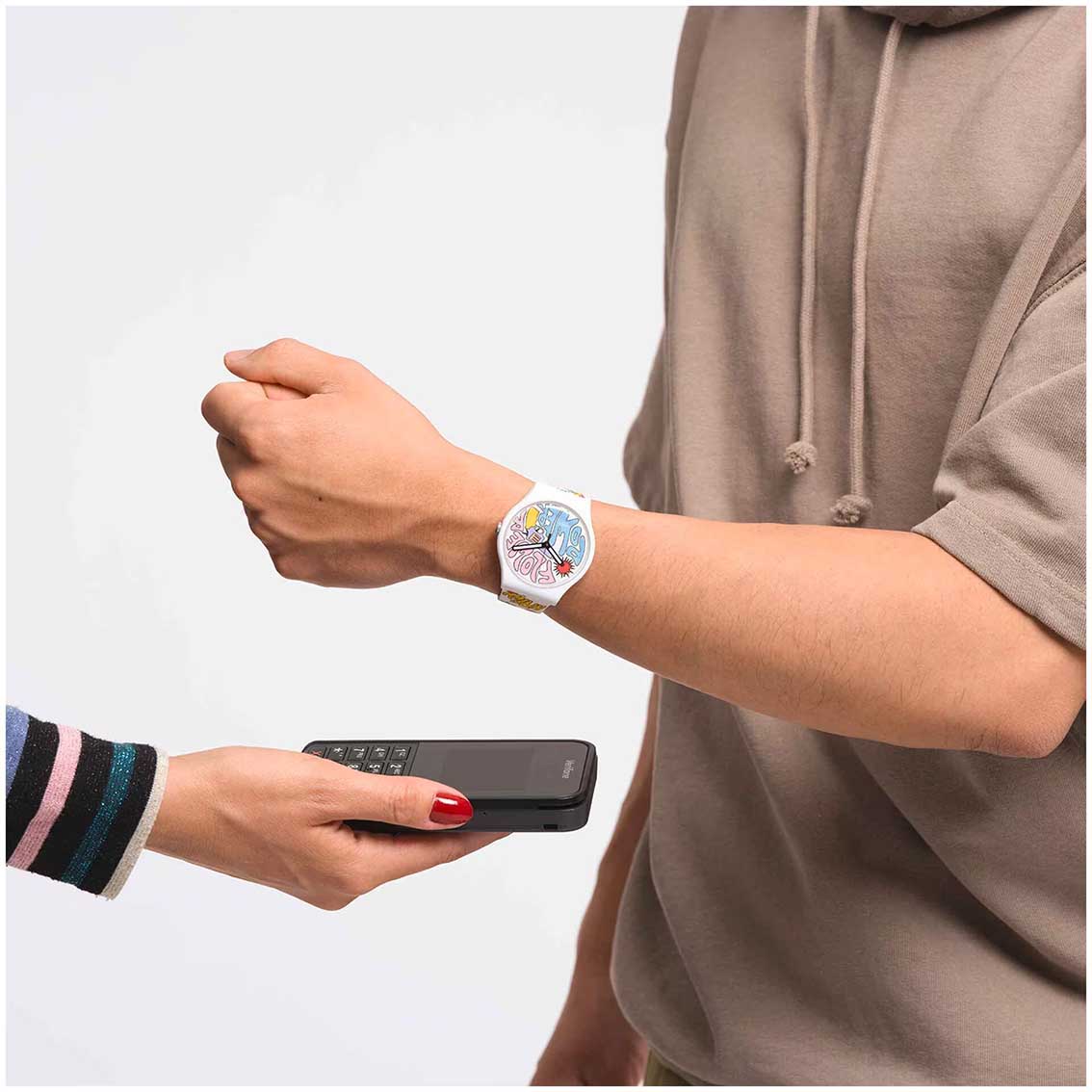 Часы Swatch New Gent Bioceramic Swatch Pay! SO32W108-5300 — это стильный и универсальный аксессуар, подходящий как для мужчин, так и для женщин. Часы поддерживают функцию бесконтактной оплаты SwatchPAY!. Часы PEACEPAY! отличаются белым циферблатом с разноцветным дизайном фразы "Flower Power". Они имеют белые часовую, минутную и секундную стрелки. Корпус изготовлен из биокерамики. Модель вдохновлена стилем 60-х годов, символизирующим мир и любовь. Эти часы сочетают в себе ретро-эстетику с современными материалами, создавая уникальный и яркий аксессуар. Модель отличается круглым корпусом диаметром 41 мм и толщиной 9 мм, выполненным из прочного пластика белого цвета. Стрелки с люминесцентным покрытиемЛюминесцентное покрытиеПозволяет считывать показания времени в темноте. Производители наносят на стрелки, часовые индексы, безель или поверхность циферблата светонакопительный состав, дающий холодное свечение.. Часы оснащены кварцевым механизмом, обеспечивающим точное измерение времени. Стекло из плексигласа защищает циферблат от царапин и повреждений. Ремешок выполнен из силикона, что обеспечивает комфорт при носке. Водонепроницаемость 3 бар позволяет не беспокоиться о случайных брызгах или кратковременном погружении в воду. Модель SO32W108-5300 не имеет функции отображения даты, что придает циферблату минималистичный и чистый вид. Эти часы станут ярким акцентом в любом образе. Они идеально подойдут как для повседневной носки, так и для особых случаев, привлекая внимание своим необычным цветовым решением и современным дизайном.