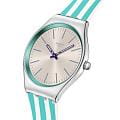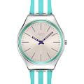 Женские наручные ультратонкие часы Swatch BEACH HOUR SYXS160 — это стильный и современный аксессуар для тех, кто ценит лёгкость и комфорт. Блестящий корпус и пряжка выполнены из нержавеющей стали серебристого цвета, диаметром 38 мм и толщиной 5.8 мм, что обеспечивает долговечность и утончённый внешний вид. Циферблат защищён органическим стеклом, устойчивым к повреждениям. Модель оснащена кварцевым механизмом, обеспечивающим высокую точность хода. Стрелки с люминесцентным покрытиемЛюминесцентное покрытиеПозволяет считывать показания времени в темноте. Производители наносят на стрелки, часовые индексы, безель или поверхность циферблата светонакопительный состав, дающий холодное свечение.. Матовым силиконовый ремешок на стандартной застёжке гармонично дополняет корпус и обеспечивает комфортное ношение. Водозащита 30 метров делает часы практичными для повседневного использования. Эти часы подойдут для повседневного ношения и станут ярким акцентом в вашем наряде.