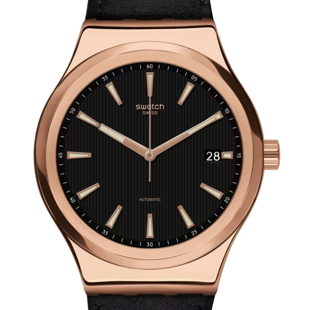 Часы Swatch SISTEM ROSEE YIG400 — это элегантная механическая модель с золотистым акцентом. Они оснащены черным циферблатом из нержавеющей стали с PVD-покрытиемPVDУльтратонкое покрытие наносится в технике вакуумного напыления, сочетает в себе нитрид титана особой прочности со слоем золота или оксида хрома. Несёт в себе декоративную или защитную функцию. цвета розового золота и кожаным ремешком на классической застежке. Стрелки с люминесцентным покрытиемЛюминесцентное покрытиеПозволяет считывать показания времени в темноте. Производители наносят на стрелки, часовые индексы, безель или поверхность циферблата светонакопительный состав, дающий холодное свечение.. Модель оснащена автоматическим механизмом Sistem51, который состоит всего из 51 детали и имеет запас хода 90 часов. Особенностью часов является прозрачная задняя крышка, позволяющая наблюдать за работой механизма. Часы водонепроницаемы до 3 бар. Часы Swatch YIG400 принадлежит к коллекции Sistem51, которая революционизировала мир автоматических часов благодаря полностью автоматизированному процессу производства и исключительным антимагнитным свойствам.