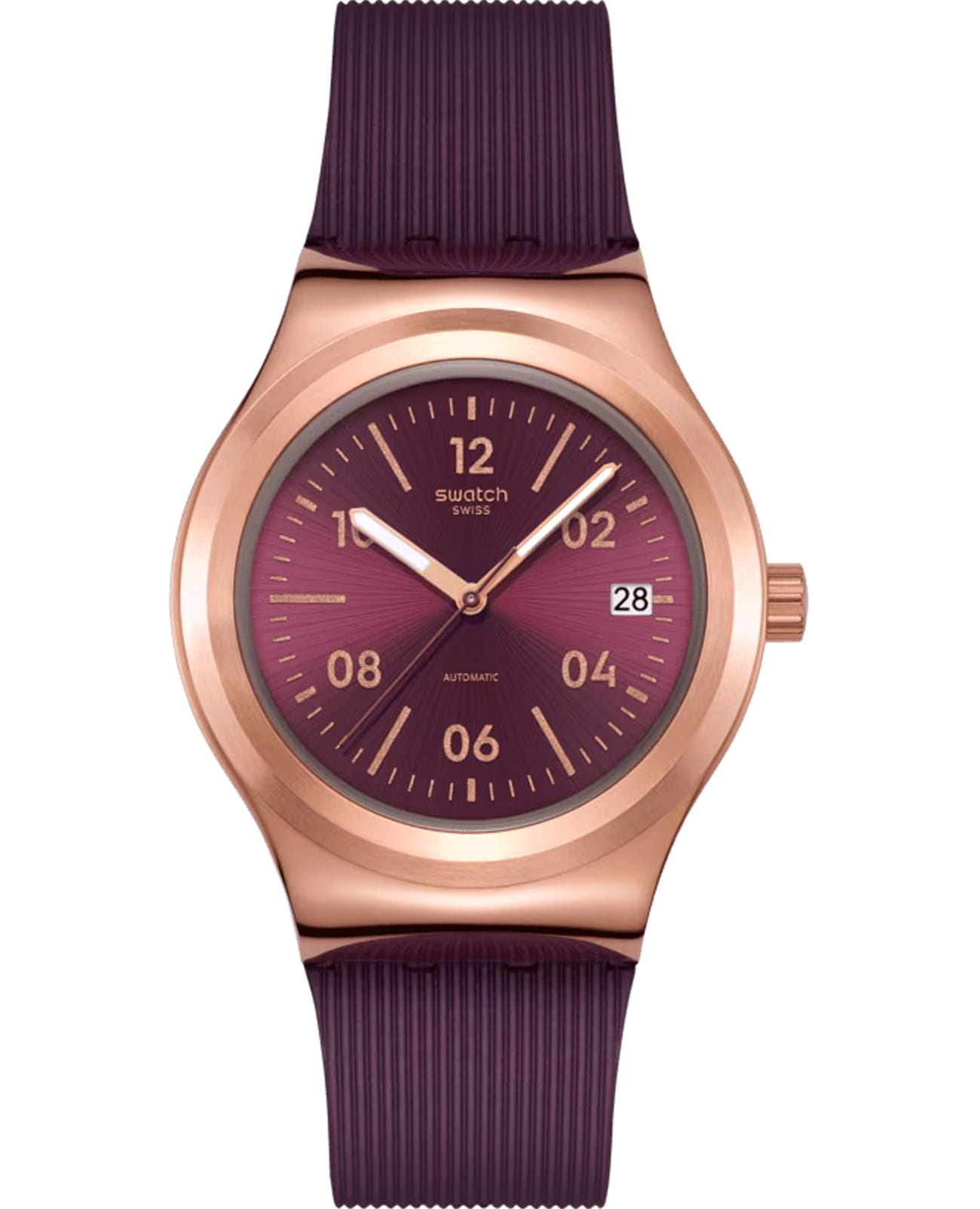 Женские наручные часы Swatch BURGUNDY STORY YIG401 — это стильный и современный аксессуар для тех, кто ценит лёгкость и комфорт. Корпус выполнен из нержавеющей стали с PVD-покрытиемPVDУльтратонкое покрытие наносится в технике вакуумного напыления, сочетает в себе нитрид титана особой прочности со слоем золота или оксида хрома. Несёт в себе декоративную или защитную функцию. цвета розового золота, диаметром 42 мм и толщиной 13.8 мм, что обеспечивает долговечность и утончённый внешний вид. Циферблат защищён органическим стеклом, устойчивым к повреждениям. Модель оснащена автоматическим механизмом SISTEM51, обеспечивающим высокую точность хода. Окошко даты находится в положении 3 часа. Стрелки с люминесцентным покрытиемЛюминесцентное покрытиеПозволяет считывать показания времени в темноте. Производители наносят на стрелки, часовые индексы, безель или поверхность циферблата светонакопительный состав, дающий холодное свечение.. Силиконовый ремешок с эффектом Anodamazing на стандартной застёжке гармонично дополняет корпус и обеспечивает комфортное ношение. Водозащита 30 метров делает часы практичными для повседневного использования. Эти часы подойдут для повседневного ношения и станут ярким акцентом в вашем наряде.