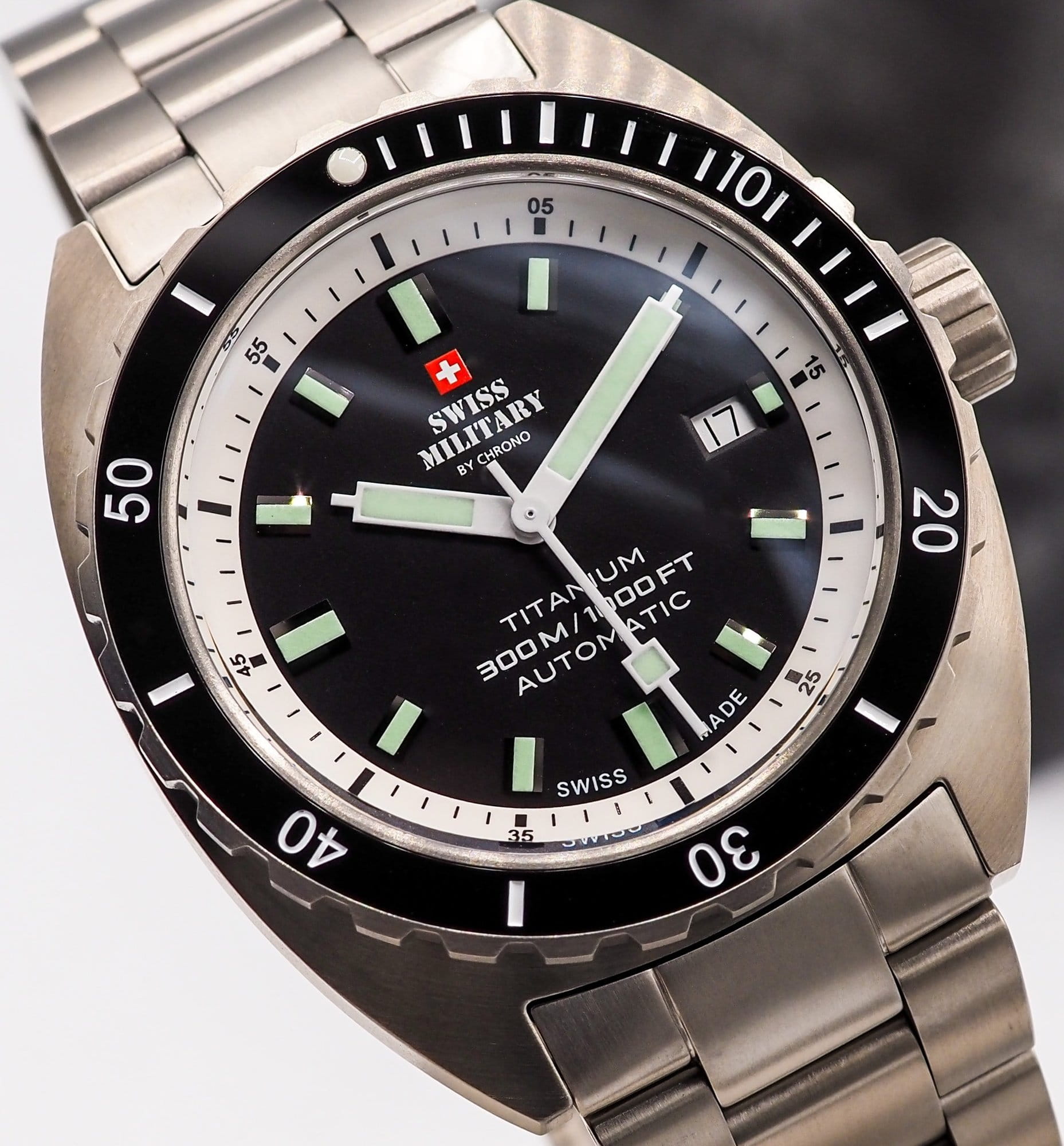 Мужские швейцарские механические часы с автоподзаводом Swiss Military by Chrono Titanium 300 SMA34100.02. Сапфировое стеклоСапфировое стеклоПрочный и надёжный материал из кристалла сапфира синтетического происхождения, характеризующийся особой твёрдостью и устойчивостью к царапинам и повреждениям. устойчивое к появлению царапин, обладающее высокой прозрачностью. Корпус часов изготовлен из титана. Вращающийся безельБезельВнешний ободок, закрепляющий стекло. В спортивных часах так называется поворотное кольцо с делениями на циферблате, выполняет роль таймера – замеряет отрезки времени на шкале. Неподвижный безель – элемент декора. Однонаправленно вращающийся безель на дайверских часах позволяет фиксировать моменты погружения и выныривания на поверхность. из высокотехнологичной керамикиВысокотехнологичная керамикаИнновационный запатентованный Rado материал с гладкой или матовой поверхностью. Керамика за счёт кристаллической структуры обладает повышенной устойчивостью от возникновения царапин. Материал способен принимать температуру тела человека, обеспечивая невероятный комфорт при ношении.. Индикация даты на позиции трех часов. Стрелки и метки с люминесцентной подсветкойЛюминесцентное покрытиеПозволяет считывать показания времени в темноте. Производители наносят на стрелки, часовые индексы, безель или поверхность циферблата светонакопительный состав, дающий холодное свечение.. Класс водозащиты: 300 метров, позволит плавать, нырять и заниматься другими водными видами спорта. Титановый браслет на раскладной застёжкеРаскладная застёжкаТакой тип застёжки используется только на браслетах из металла. Она никогда не раскрывается полностью, происходит разделение на 2 и более частей. Раскладывающая застёжка снизит вероятность потери часов к минимуму..