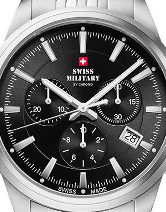 Часы Swiss Military SM34107.01 — это хронограф, сочетающий стиль и функциональность. Корпус диаметром 40 мм выполнен из нержавеющей стали, что обеспечивает долговечность и надёжность. Циферблат с солнечным узором украшен белыми люминесцентными индексамиЛюминесцентное покрытиеПозволяет считывать показания времени в темноте. Производители наносят на стрелки, часовые индексы, безель или поверхность циферблата светонакопительный состав, дающий холодное свечение. и стрелками, что позволяет легко считывать время в любых условиях. Защиту циферблата обеспечивает сапфировое стеклоСапфировое стеклоПрочный и надёжный материал из кристалла сапфира синтетического происхождения, характеризующийся особой твёрдостью и устойчивостью к царапинам и повреждениям., устойчивое к царапинам. Водозащита до 10 ATM делает часы подходящими для плавания и других водных активностей. Швейцарский кварцевый механизм обеспечивает высокую точность измерения времени и функции хронографа. Стальной браслет на раскладной застёжкеРаскладная застёжкаТакой тип застёжки используется только на браслетах из металла. Она никогда не раскрывается полностью, происходит разделение на 2 и более частей. Раскладывающая застёжка снизит вероятность потери часов к минимуму. гарантирует комфортное ношение и надёжную фиксацию. Часы сопровождаются 5-летней международной гарантией, подтверждающей их высокое качество и надёжность. Swiss Military — это идеальный выбор для мужчин, которые ценят швейцарское качество и ведут активный образ жизни.
