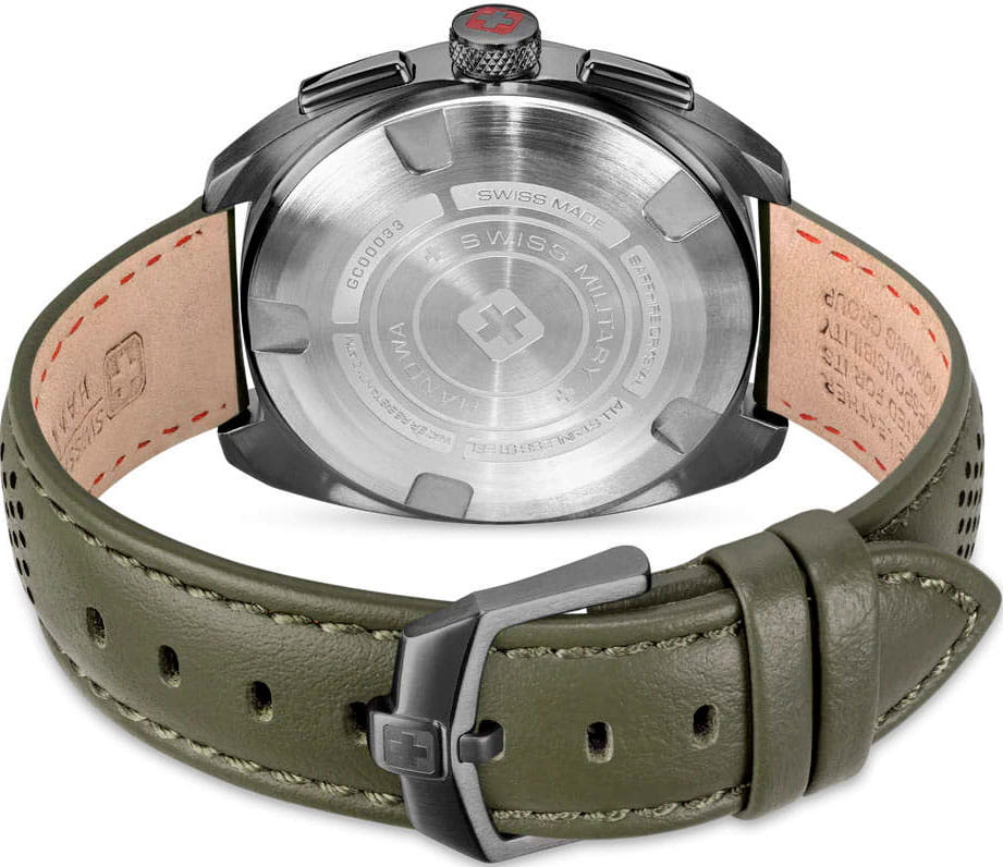 Мужские швейцарские часы-хронографХронографФункция позволяет измерять отрезки времени с особой точностью: часы, минуты, секунды. Верным признаком хронографа является наличие на циферблате 3 дополнительных окошек-счётчиков. Swiss Military Hanowa SMWGC0003340, кварцевый механизм с высокой точностью. Сапфировое стеклоСапфировое стеклоПрочный и надёжный материал из кристалла сапфира синтетического происхождения, характеризующийся особой твёрдостью и устойчивостью к царапинам и повреждениям. устойчивое к появлению царапин, обладающее высокой прозрачностью. Класс водозащиты: 100 метров, позволит плавать, нырять и заниматься другими водными видами спорта. Корпус часов изготовлен из стали с IP-покрытиемIP-покрытиеМетод ионного напыления. Демонстрирует повышенную устойчивость к истиранию, окислению и химическим веществам. Под воздействием высокого давления и температуры около 1500°C молекулы металла надёжно соединяются с частицами корпуса часов.. Кожаный ремешок. БезельБезельВнешний ободок, закрепляющий стекло. В спортивных часах так называется поворотное кольцо с делениями на циферблате, выполняет роль таймера – замеряет отрезки времени на шкале. Неподвижный безель – элемент декора. Однонаправленно вращающийся безель на дайверских часах позволяет фиксировать моменты погружения и выныривания на поверхность. с тахиметромТахиметрРазмеченная шкала, располагается на ободке или безеле часов. Тахиметр позволяет рассчитать скорость на определённом участке пути, расстояние измеряется в километрах или милях. изготовлен из нержавеющей стали с IP-покрытиемIP-покрытиеМетод ионного напыления. Демонстрирует повышенную устойчивость к истиранию, окислению и химическим веществам. Под воздействием высокого давления и температуры около 1500°C молекулы металла надёжно соединяются с частицами корпуса часов..