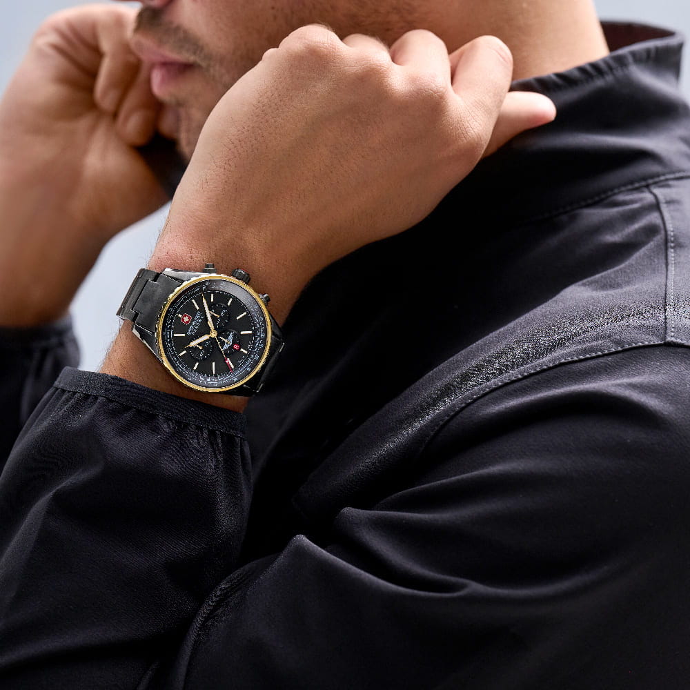 Мужские швейцарские часы c хронографомХронографФункция позволяет измерять отрезки времени с особой точностью: часы, минуты, секунды. Верным признаком хронографа является наличие на циферблате 3 дополнительных окошек-счётчиков. Swiss Military Hanowa SMWGI0000341, кварцевый механизм с высокой точностью. Сапфировое стеклоСапфировое стеклоПрочный и надёжный материал из кристалла сапфира синтетического происхождения, характеризующийся особой твёрдостью и устойчивостью к царапинам и повреждениям. устойчивое к появлению царапин, обладающее высокой прозрачностью. Класс водозащиты: 100 метров, позволит плавать, нырять и заниматься другими водными видами спорта. Корпус и браслет часов изготовлены из стали с IP-покрытиемIP-покрытиеМетод ионного напыления. Демонстрирует повышенную устойчивость к истиранию, окислению и химическим веществам. Под воздействием высокого давления и температуры около 1500°C молекулы металла надёжно соединяются с частицами корпуса часов.. Индикация даты. ТахиметрТахиметрРазмеченная шкала, располагается на ободке или безеле часов. Тахиметр позволяет рассчитать скорость на определённом участке пути, расстояние измеряется в километрах или милях.. Черный циферблат с часовыми индексами в виде штрихов. Стрелки и метки с люминесцентным покрытиемЛюминесцентное покрытиеПозволяет считывать показания времени в темноте. Производители наносят на стрелки, часовые индексы, безель или поверхность циферблата светонакопительный состав, дающий холодное свечение..
